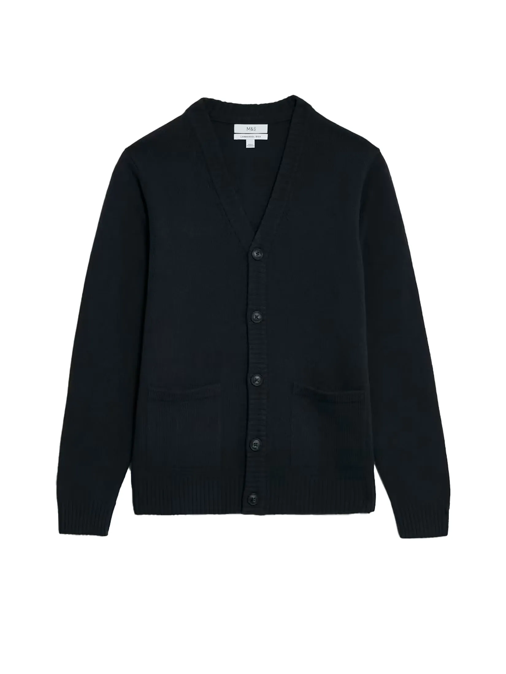 Crafted from extra-fine lambswool-rich yarn, this smart cardigan from MARKS & SPENCER is both luxuriously cosy and hardwearing. Classic v-neck for a sharp look. Neat button-through fastening. Stretchy ribbing at the cuffs, collar and hem for a snug feel. Two side pockets are perfect for warming your hands.