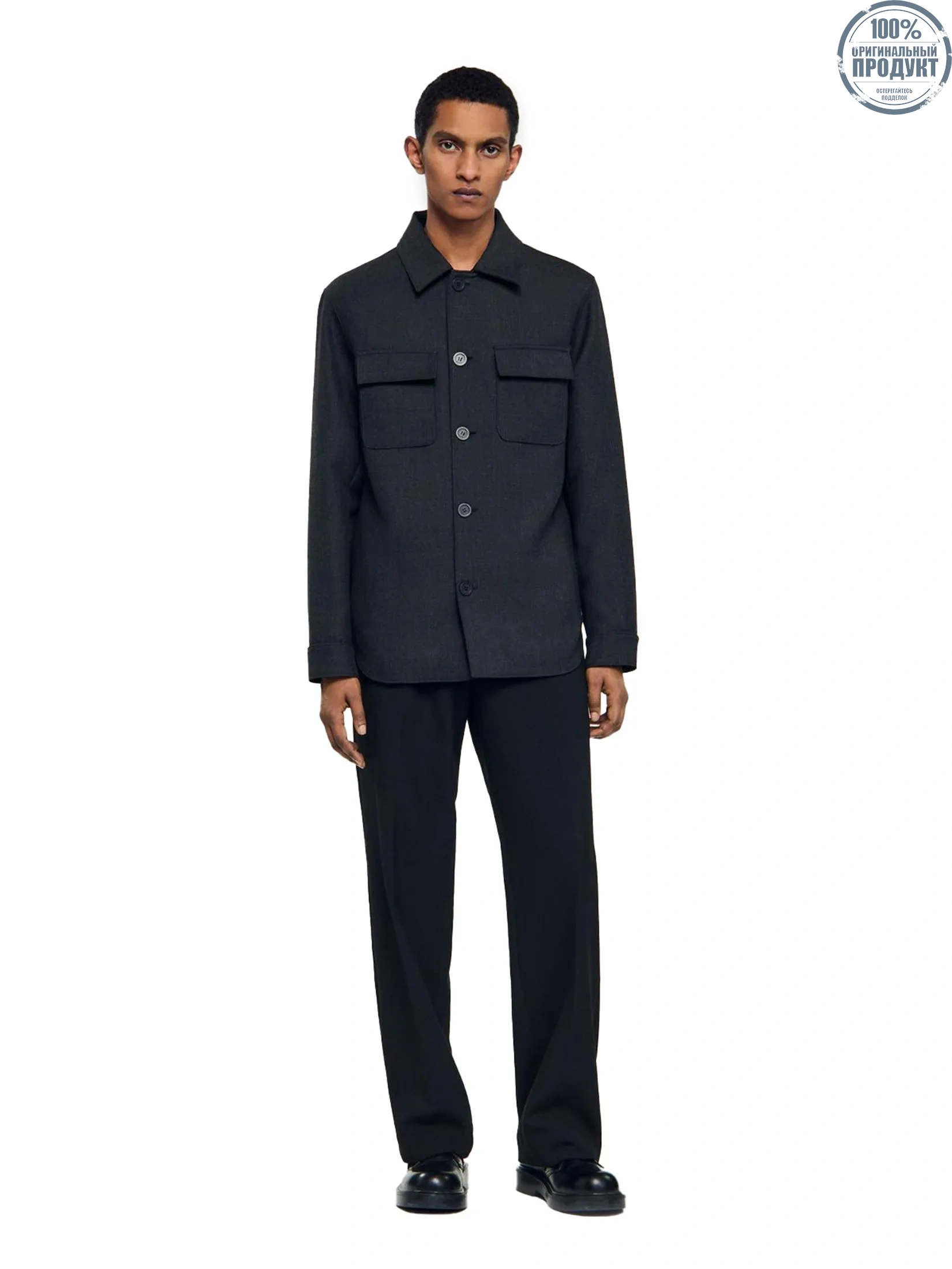 Casual wool overshirt with broken collar, long sleeves, button fastening, and front patch pockets with flaps.