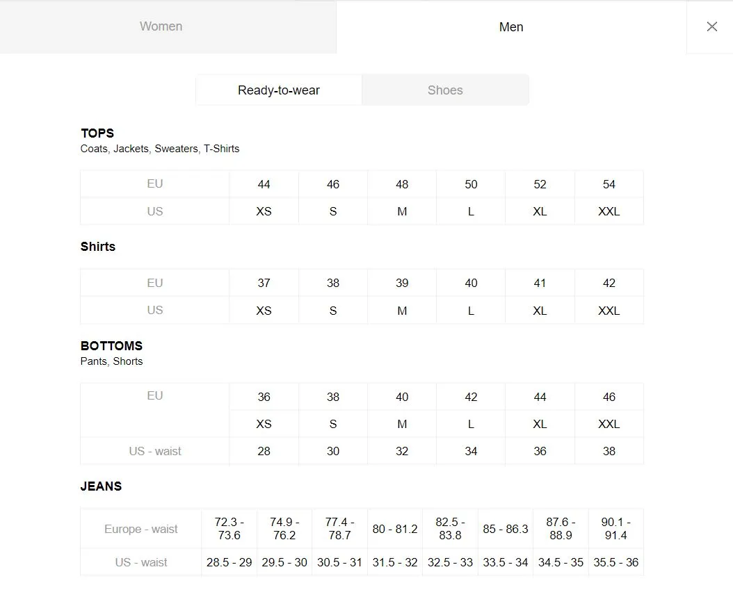 - Size Standard : EU