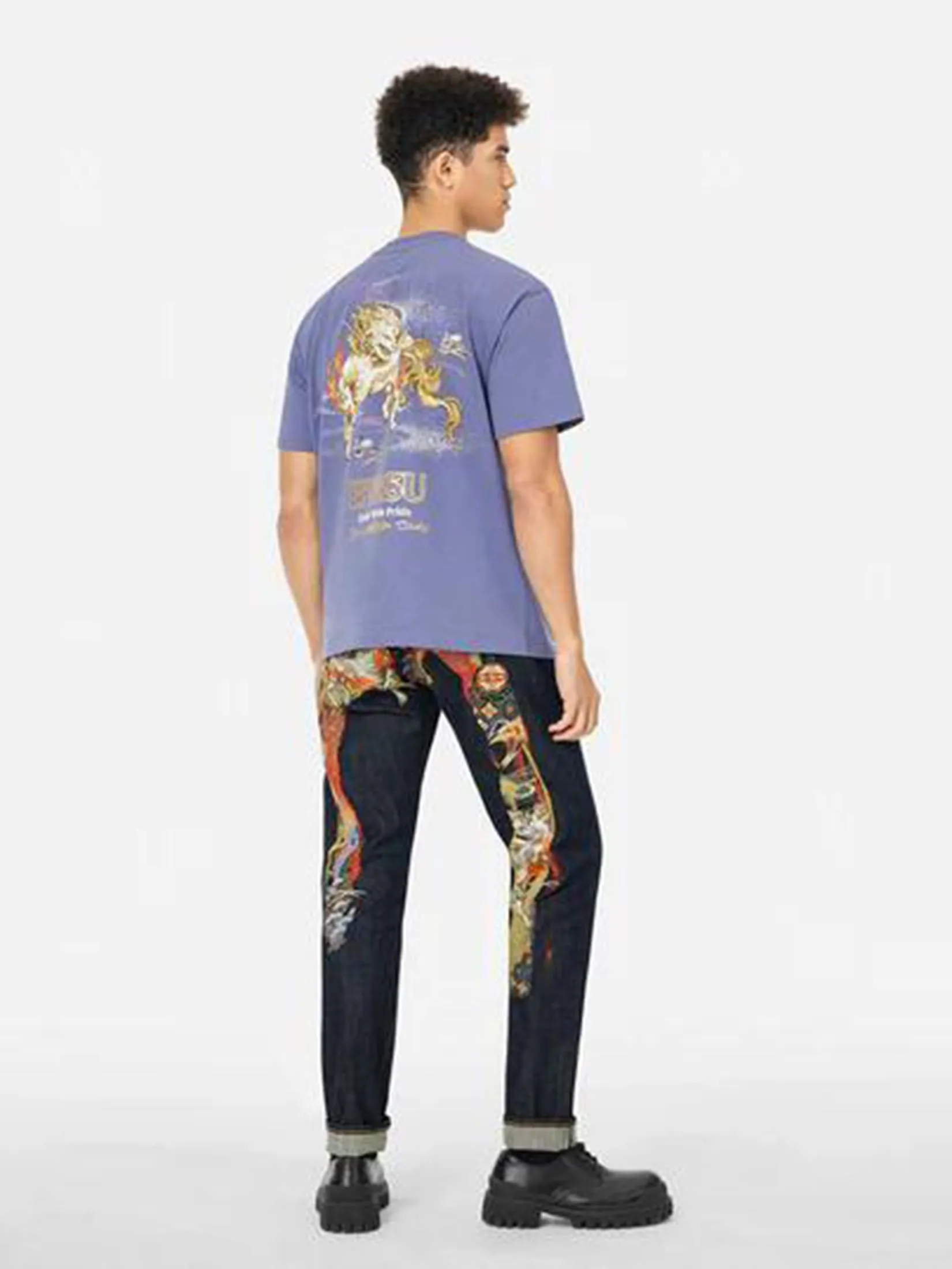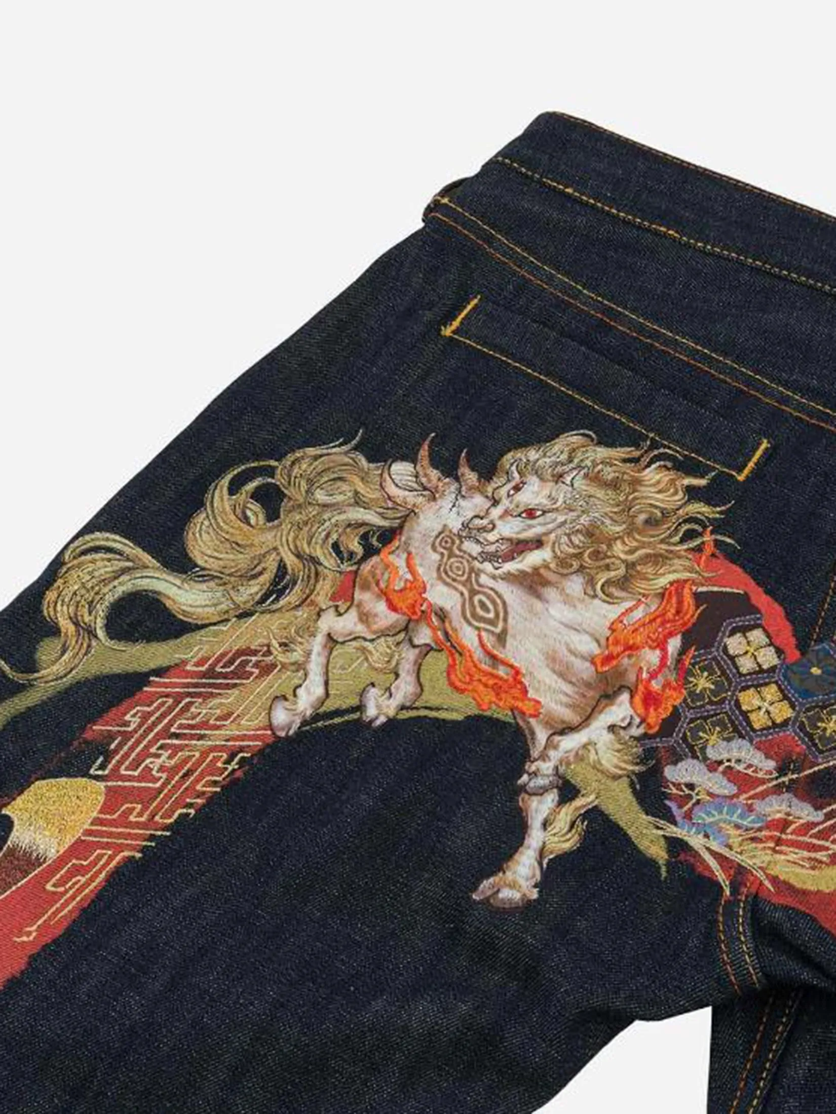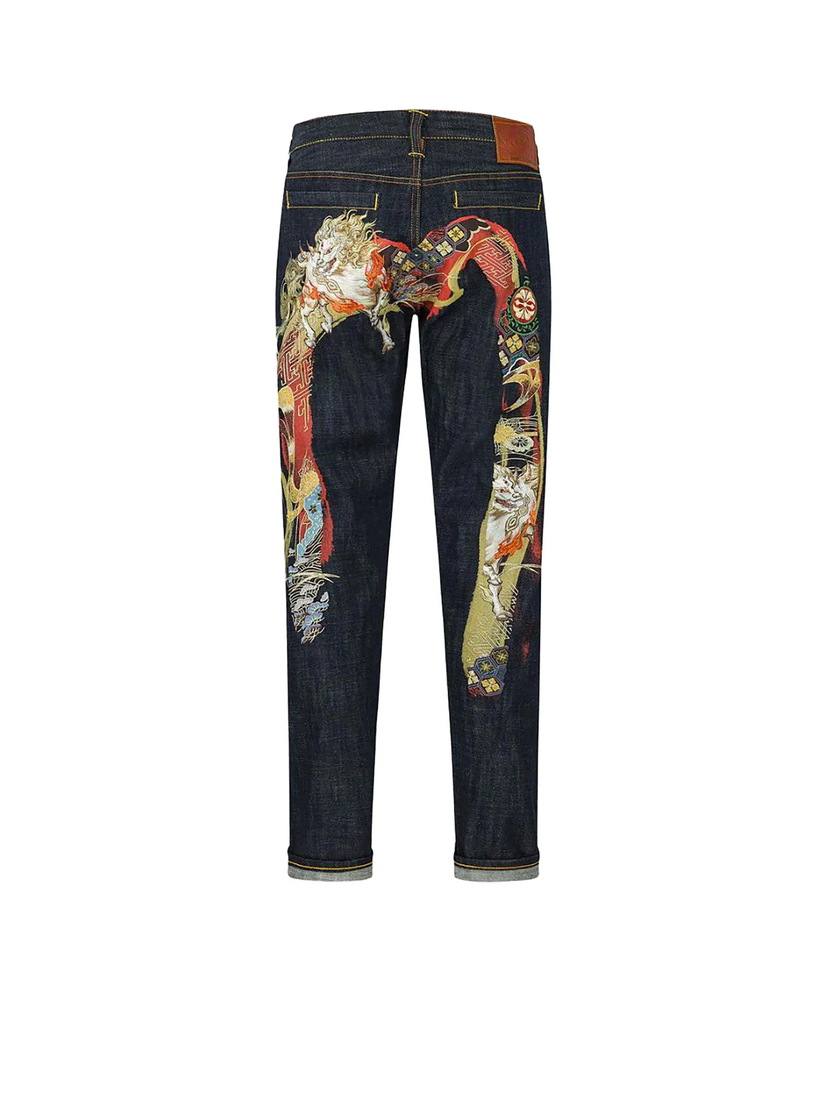 Inspired by the auspicious mythical beast Hakutaku, symbolizing good fortune, these EVISU jeans offer a refreshing visual impact. Made from cotton denim, the back features a Daicock pattern with a textured laser print below, topped with intricate Kamon embroidery in vibrant colors. This layered design exudes luxury and elegance.