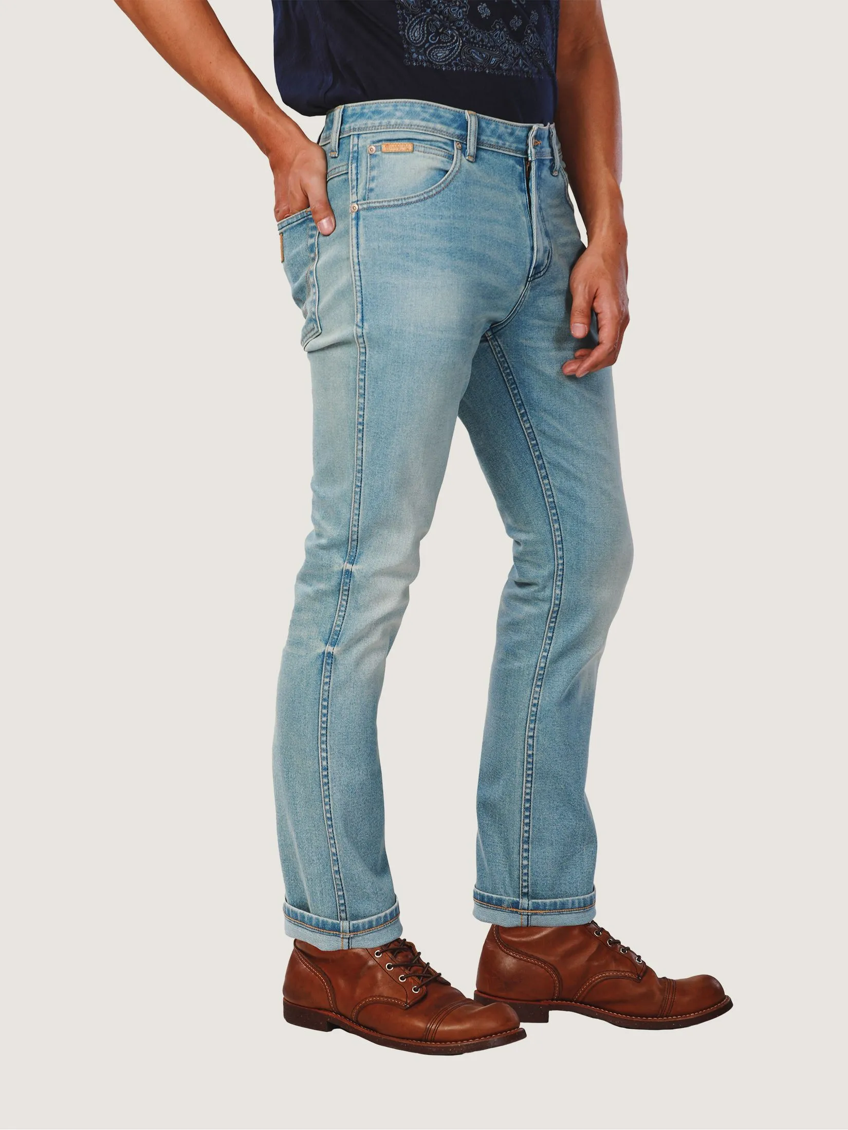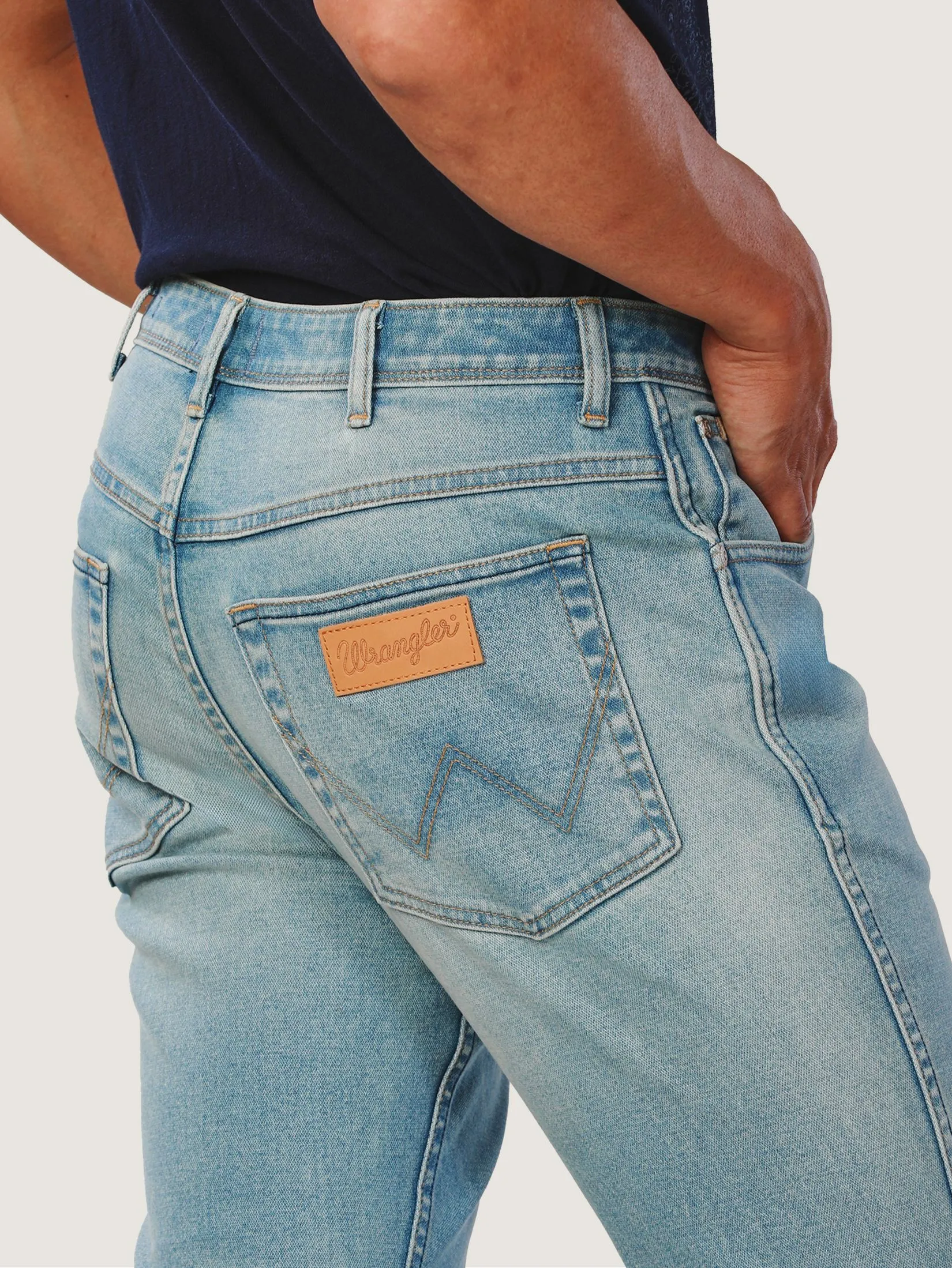 Texas Slim Fit Men's Jeans, mid waist slimin light indigo color from Everyday with Wrangler collection. Made from 98%Cotton 2%Elastane (13 Oz.), broken twill, using Odor fabric technology designed to reduce unpleasant sweat odors by absorbing moisture and inhibiting bacterial growth, keeping the fabric clean and fresh all day. Wear it with your favorite tops to look cool in everyday. The Everyday with Wrangler collection blends modern Western style with striking yet subtle colors, offering a unique and cool look, while providing high-quality craftsmanship that ensures comfort and readiness for every day’s adventures.