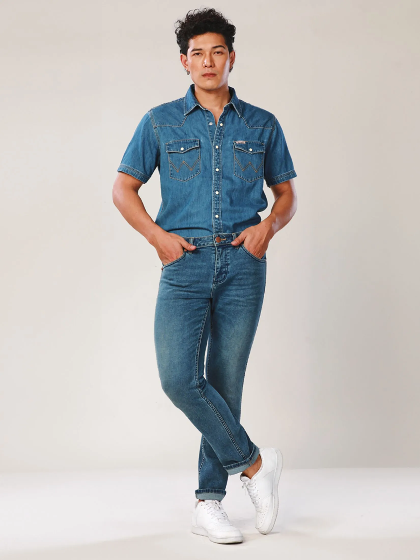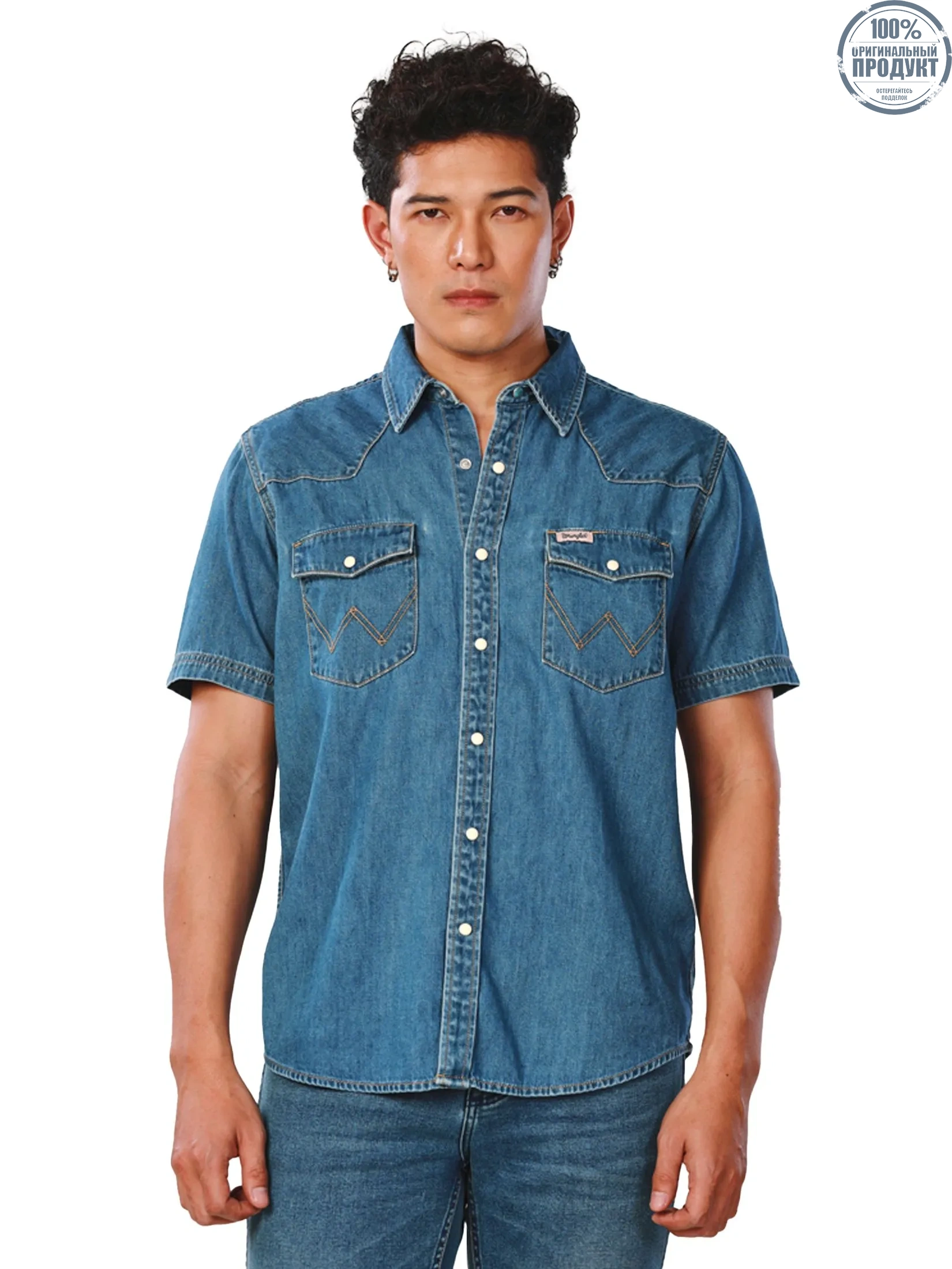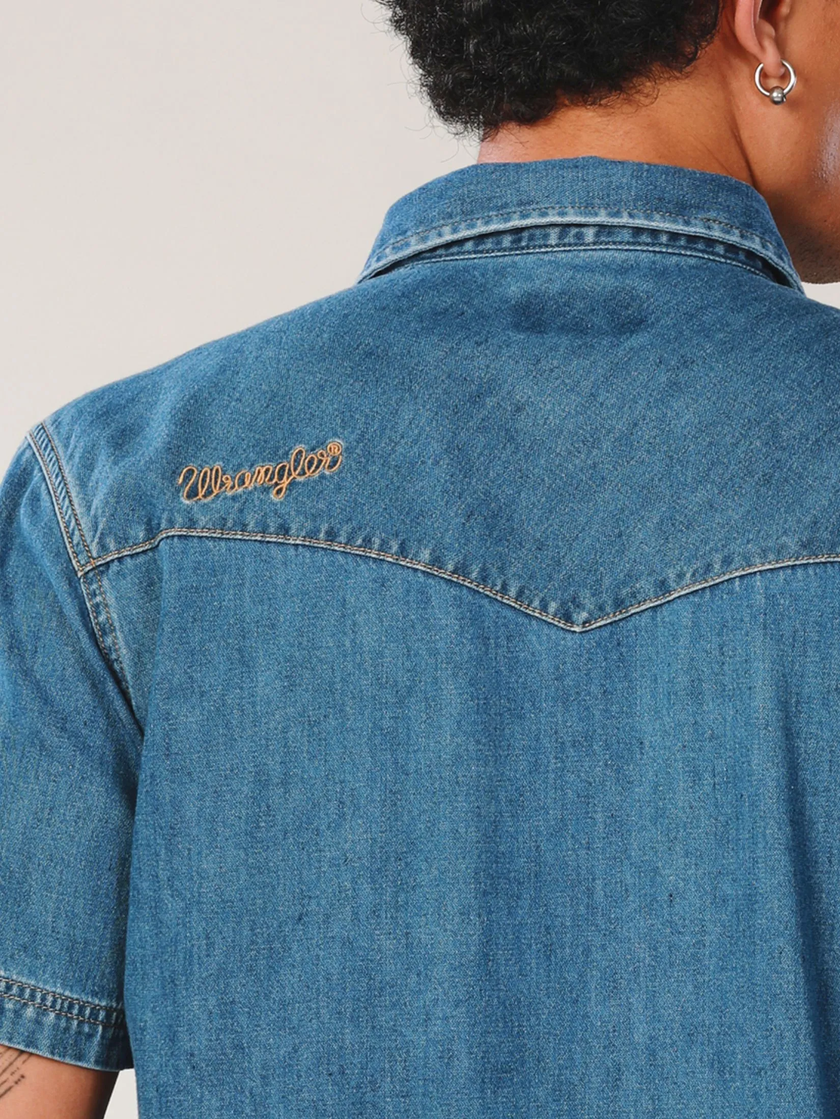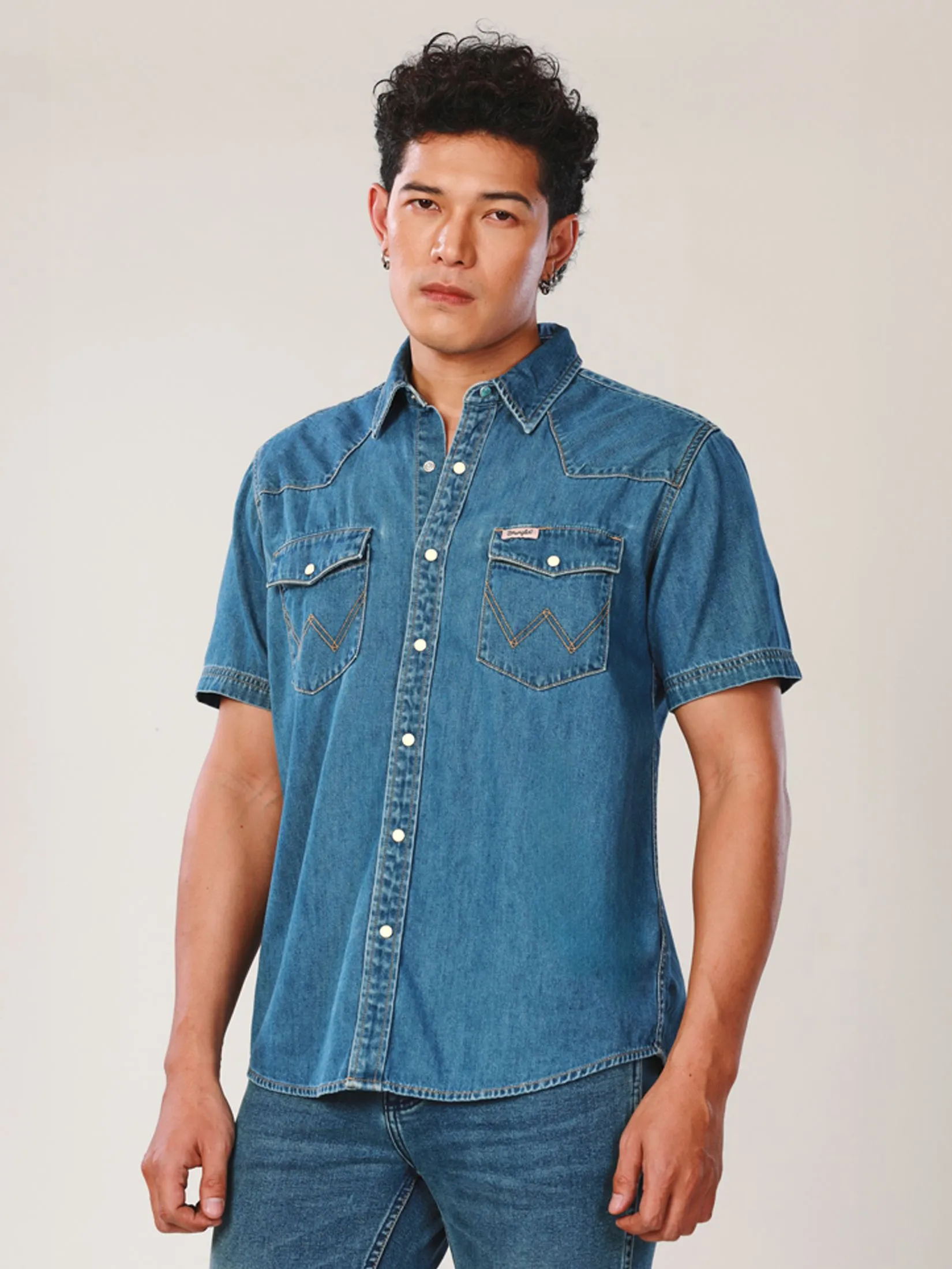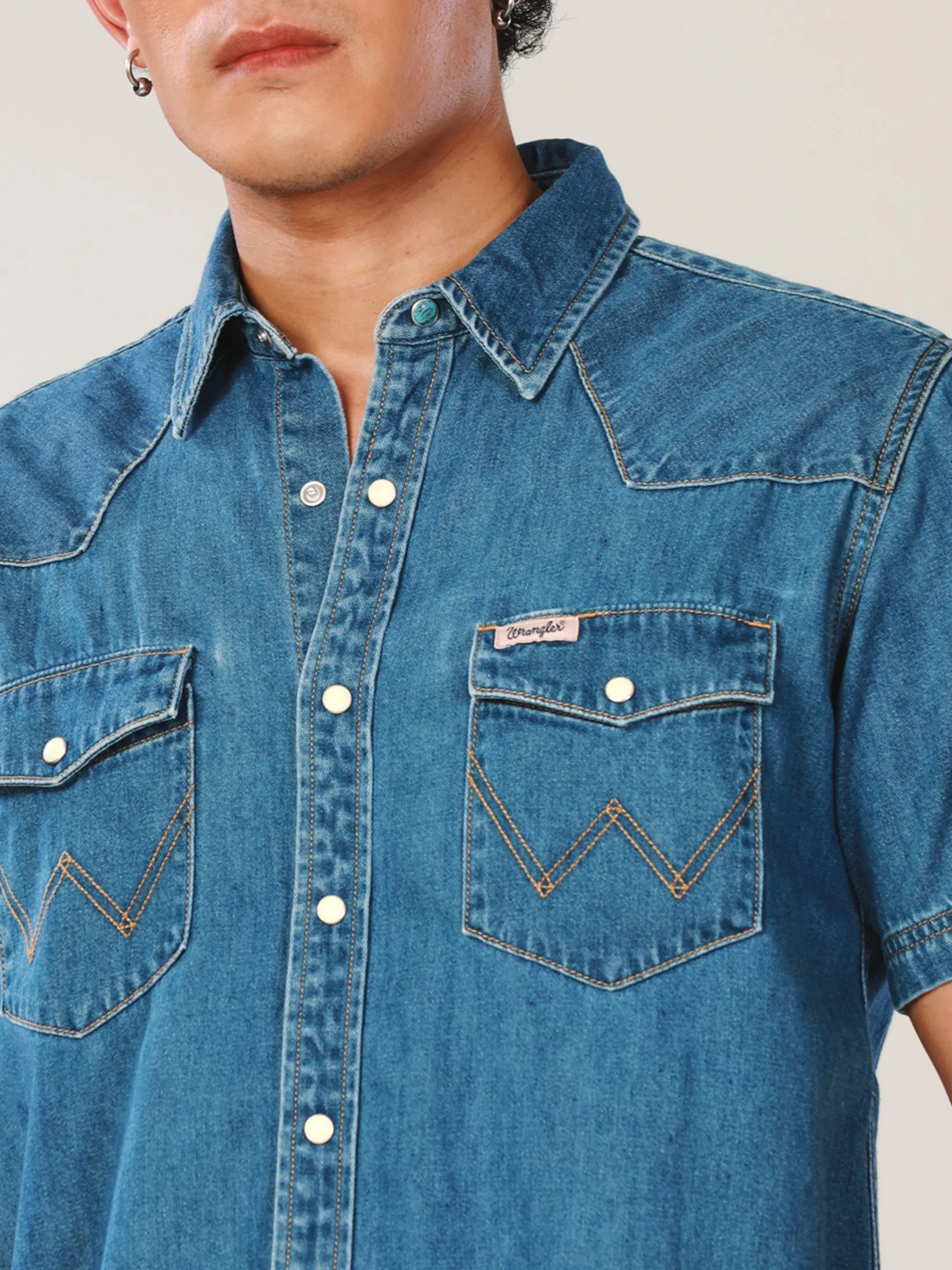 Regular Fit Men's Denim Shirt, short sleeve in mid indigo color from Everyday with Wrangler collection. Made from 100% cotton, broken twill, featuring a western yoke, turquoise collar button with blackened silver edges, and white pearl snap buttons with an embossed "W" and oxidized copper rims. Wear with your favorite jeans to make your look cool, trendy and also smart. The Everyday with Wrangler collection blends modern Western style with striking yet subtle colors, offering a unique and cool look, while providing high-quality craftsmanship that ensures comfort and readiness for every day’s adventures.