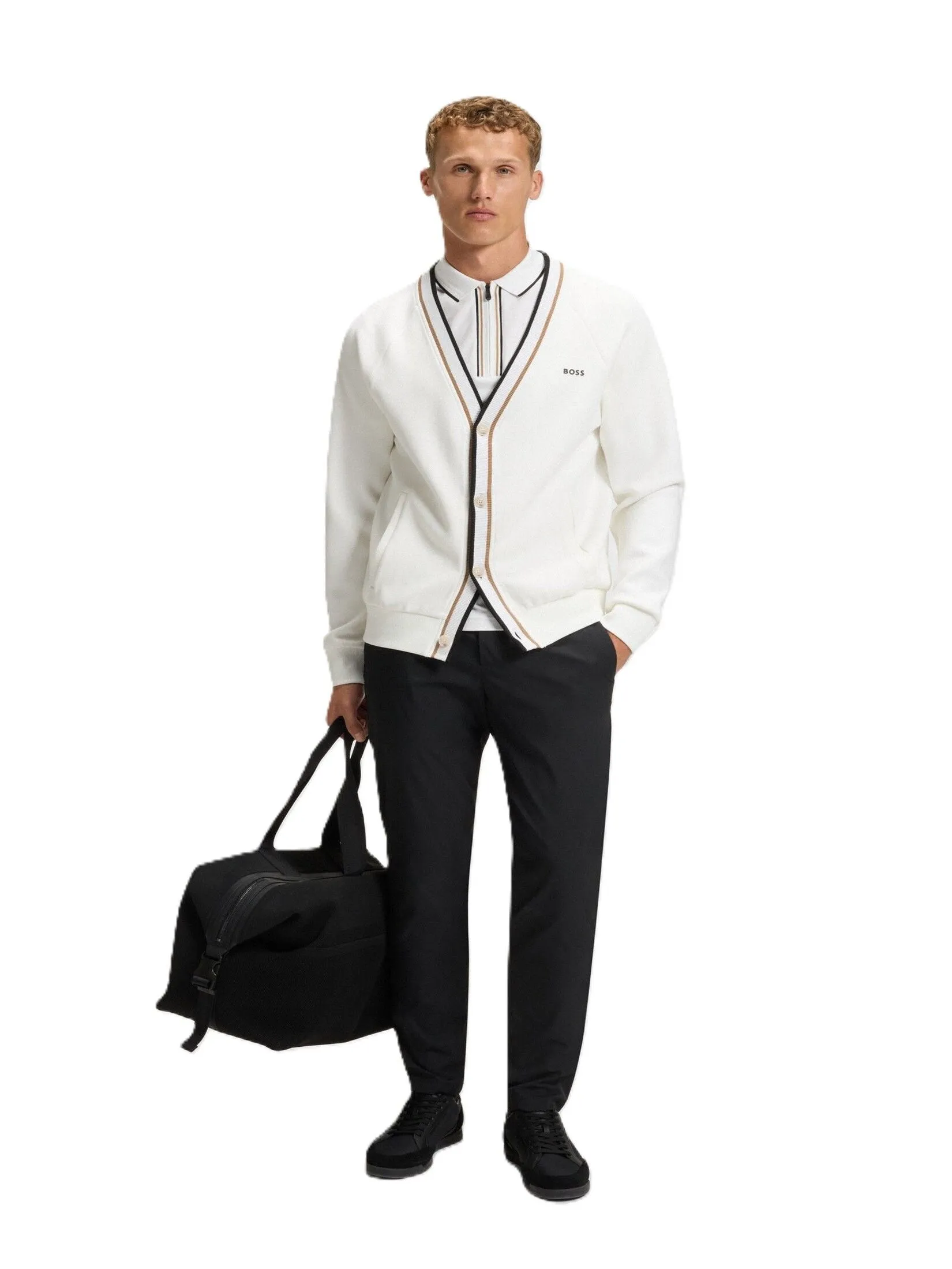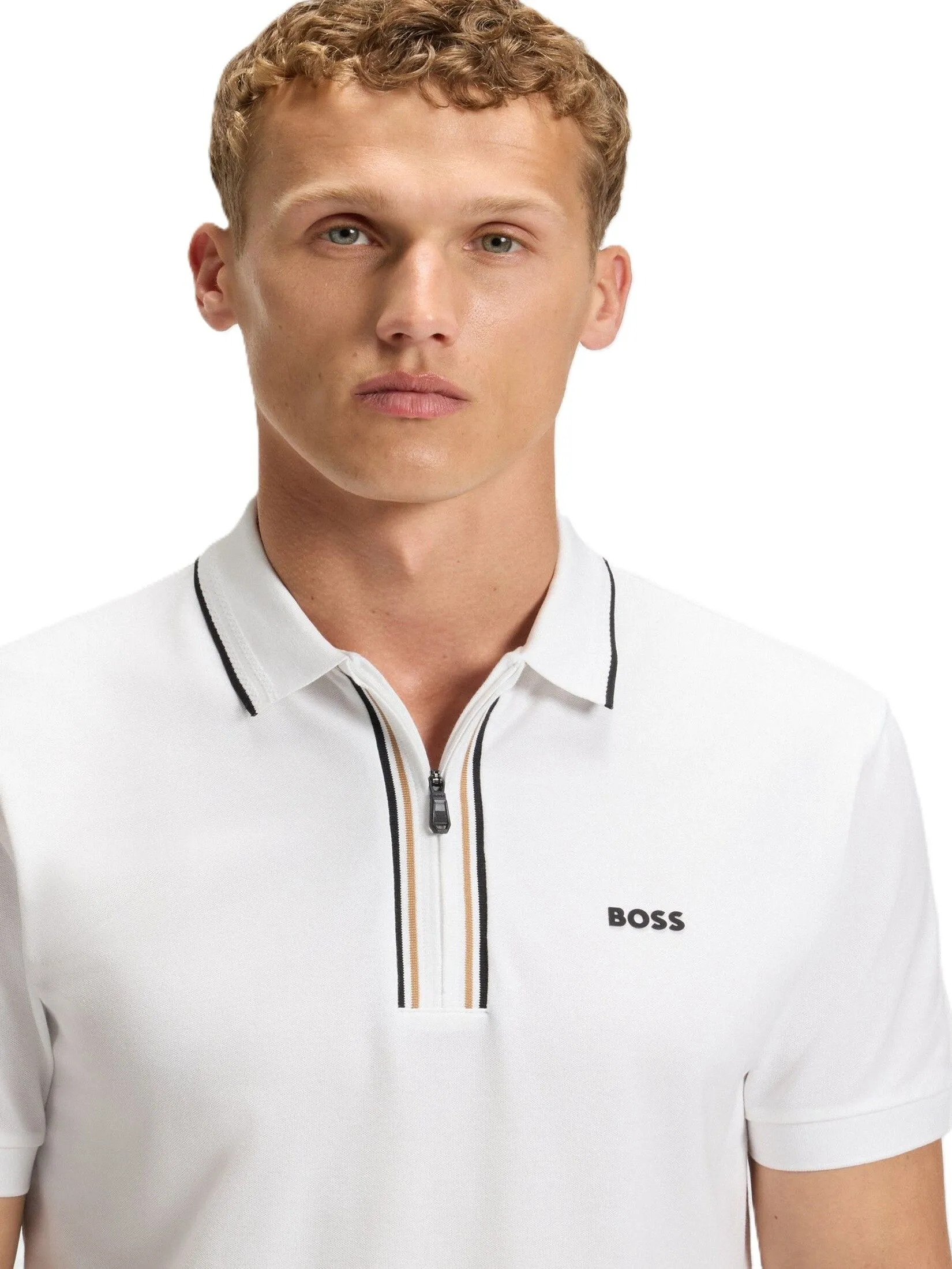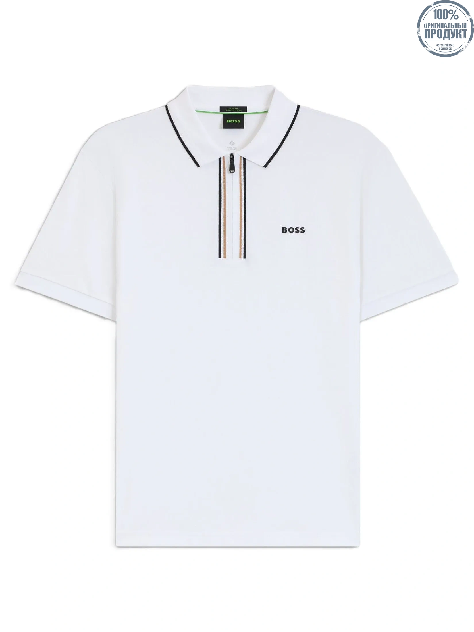 Made in cotton with four-way stretch for active comfort, this slim-fitting BOSS Menswear polo shirt offers moisture management. Stripe details and zip placket.