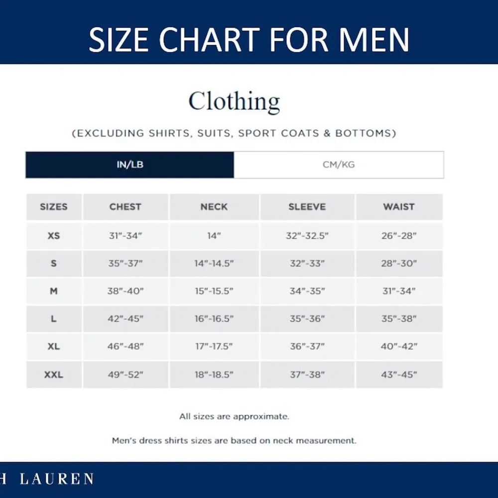 Size ChartSize : Chest (inches) : Neck (inches) : Sleeve (inches) : Waist (inches)