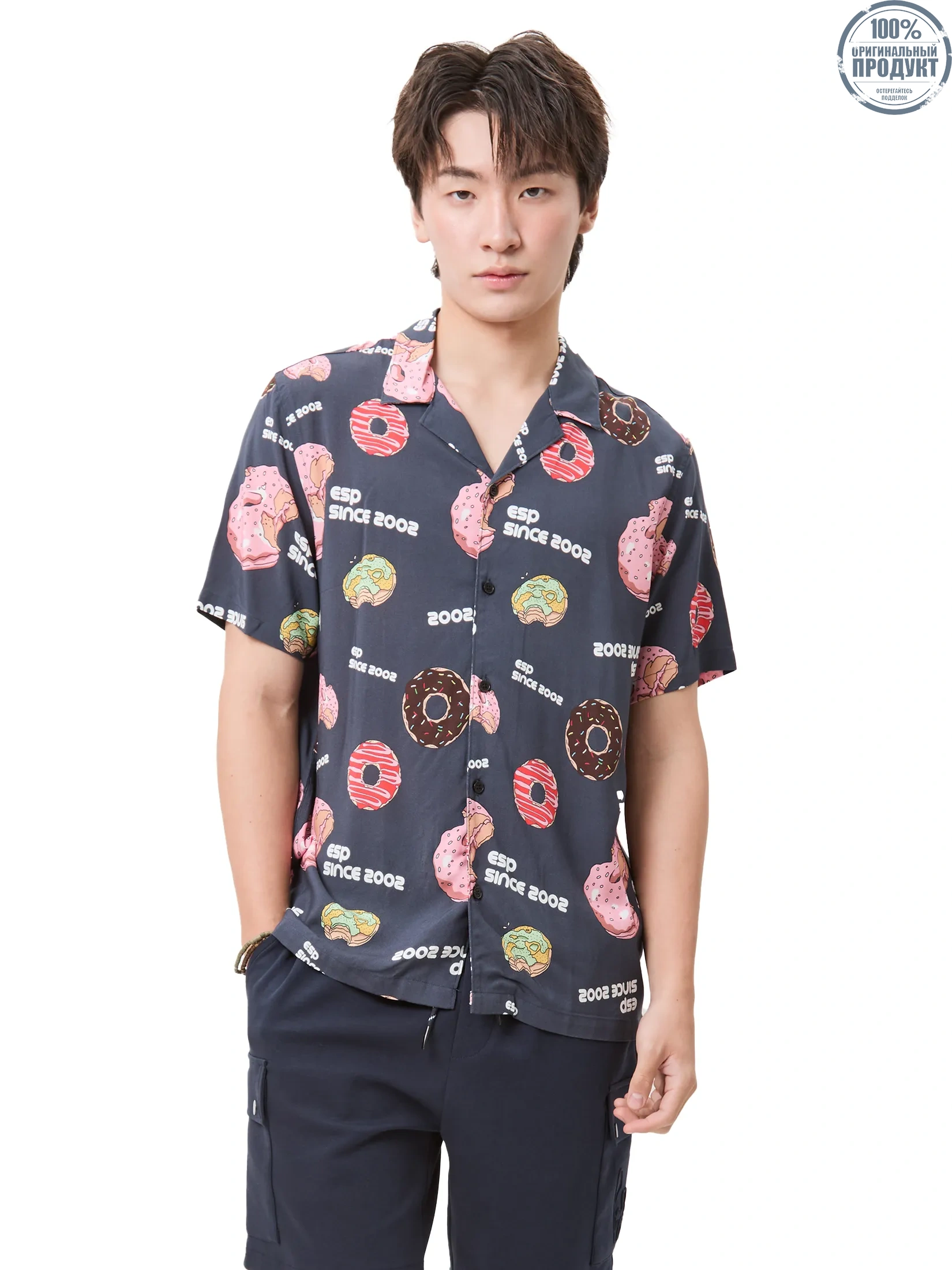 This super chill Hawaiian shirt originated in Hawaii in the early 20th century. It features vibrant and colorful patterns. The navy blue Frenchie pattern, colorful donuts, and white ESP Since 2002 letters reflect a person who loves freedom, fun, and creativity. The fabric is soft, comfortable, and stretchy, perfect for Thailand s weather. It can be matched with both shorts and long pants in solid colors.