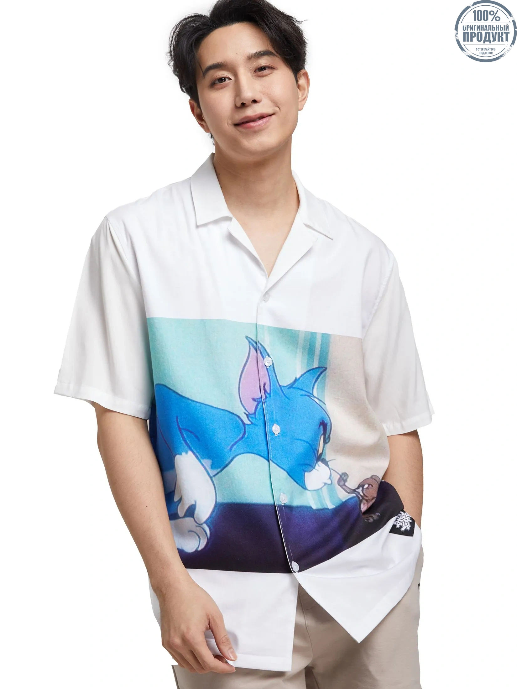 PACIFIC UNION Men Shirt Short Sleeve Oversize Tom and Jerry White