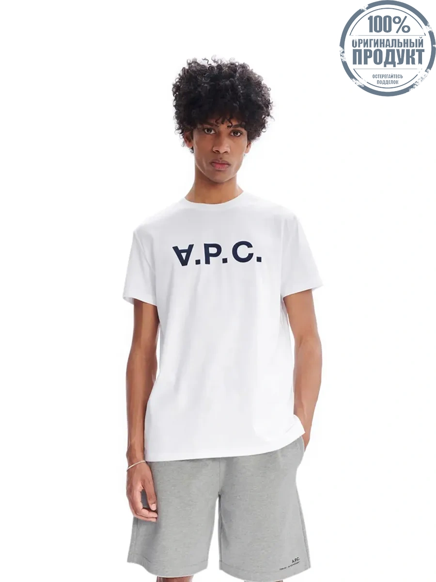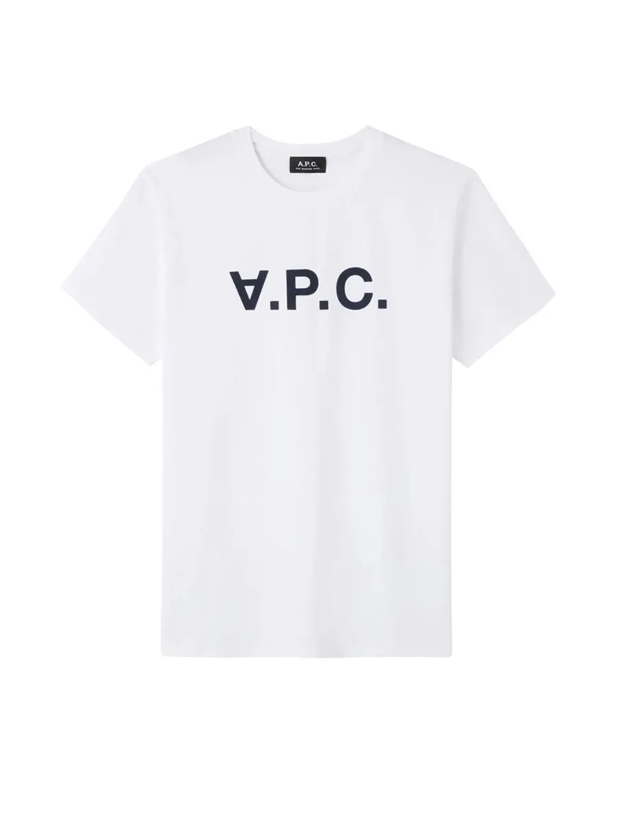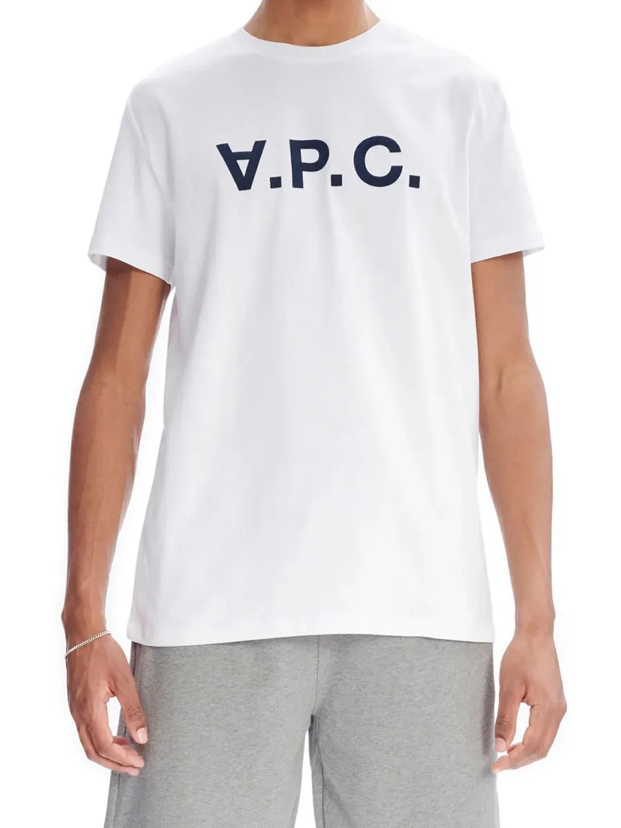 T-shirt in white organic cotton with a dark navy blue VPC logo from the brand A.P.C. is a French fashion brand known for its minimalist aesthetic and focus on high-quality materials. It's a brand that resonates with individuals who appreciate understated elegance and timeless style.