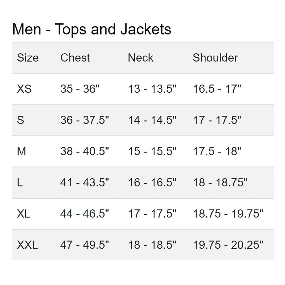 M: Chest38 - 40.5" Neck15 - 15.5" Shoulder17.5 - 18"