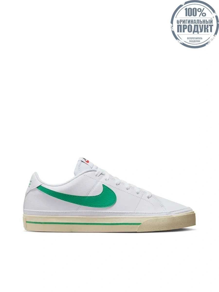 Shoes from the brand NIKE. Honoring a history rooted in tennis culture, the Nike Court Legacy Next Nature brings you a time-tested staple with a clean and classic look. Its pebbled synthetic leather upper, heritage stitching and textile tongue blend sport with fashion while vibrant green Swoosh logos and details serve up match-winning style. Synthetic leather gives you high-quality durability and comfort. Full-length rubber outsole with herringbone pattern delivers multi-surface traction. The canvas trim around the midsole adds to the classic tennis look. Whenever you see the Nike Sunburst or the name Next Nature (NN), you see one more step on our journey toward zero carbon and zero waste.