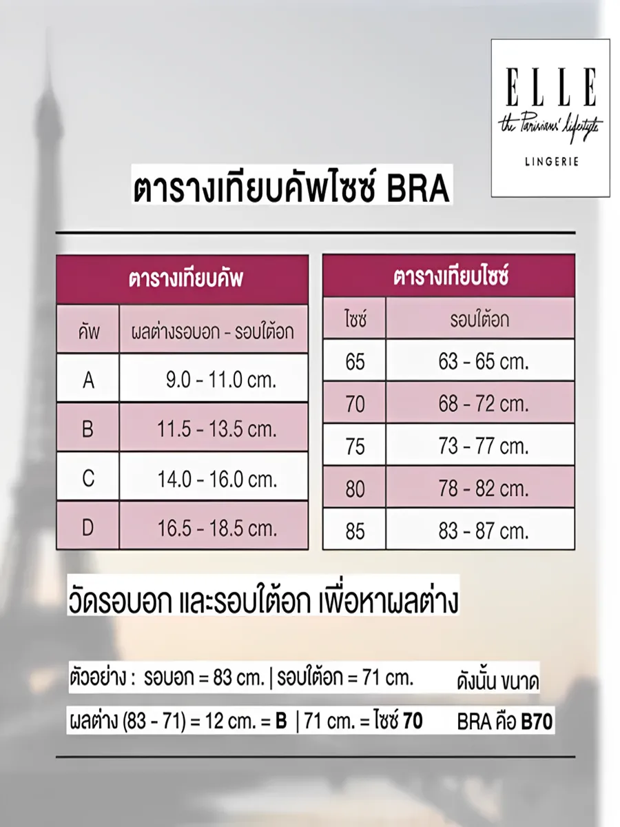 Elle Lingerie Front Hook Bra, front hook bra, decorated with pleats and lace fabric Collection: Pleat Front hook bra helps to keep the chest close to the figure, has a sponge reinforced frame, has a padded compartment for push up pads, lace fabric, soft and smooth touch. Combined with the refinement of pleats that flow in a feminine style. Lace back design, can mix and match with clothes that show the back. Conditions for exchange of underwear ELLE LINGERIE Products must be in perfect condition. There is no label tag, product price tag, a label telling how to take care of underwear. attached to the product The product must be in unwashed condition. There is no stain caused by trying on. for the hygiene of all customers All worn products cannot be exchanged or returned. The product to be replaced must be the same model as the order. Returns must not exceed 2 times and within 15 days from the date of purchase.