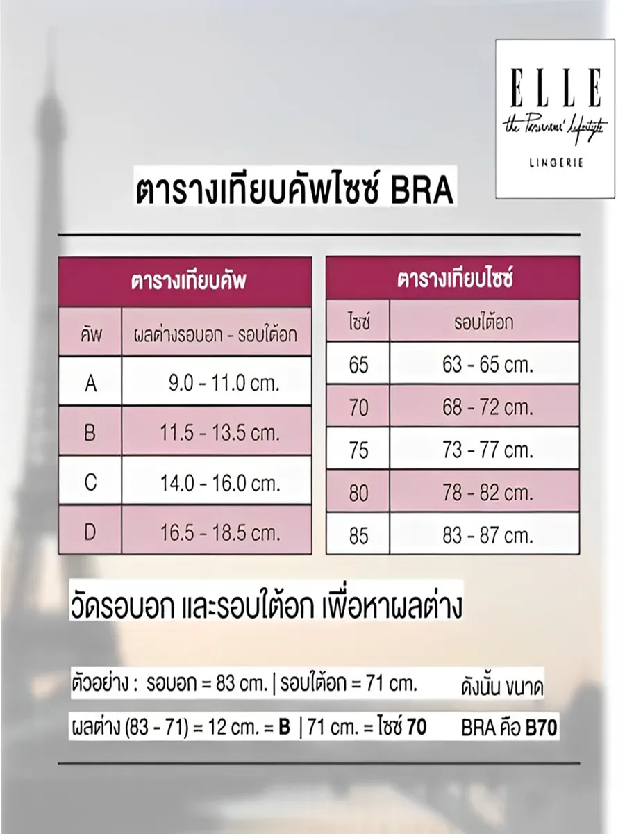 SEAMLESS bra without wires, smooth breast shape Decorated with ELLE rubber edge, comfortable to wear with FUNCTION AIR DRY MOLDED, perforated to help ventilate. make it not damp Conditions for change of ELLE LINGERIE underwear products 1. Products must be in perfect condition. There is no label tag, product price tag, a label telling how to take care of underwear. Attached to the product 2. The product must be in unwashed condition. There is no dirt that occurs when trying on. for the hygiene of all customers All worn products cannot be exchanged or returned. 3. Products to be exchanged must be the same model as purchased. 4. Returns must not exceed 2 times and within 15 days from the date of purchase.