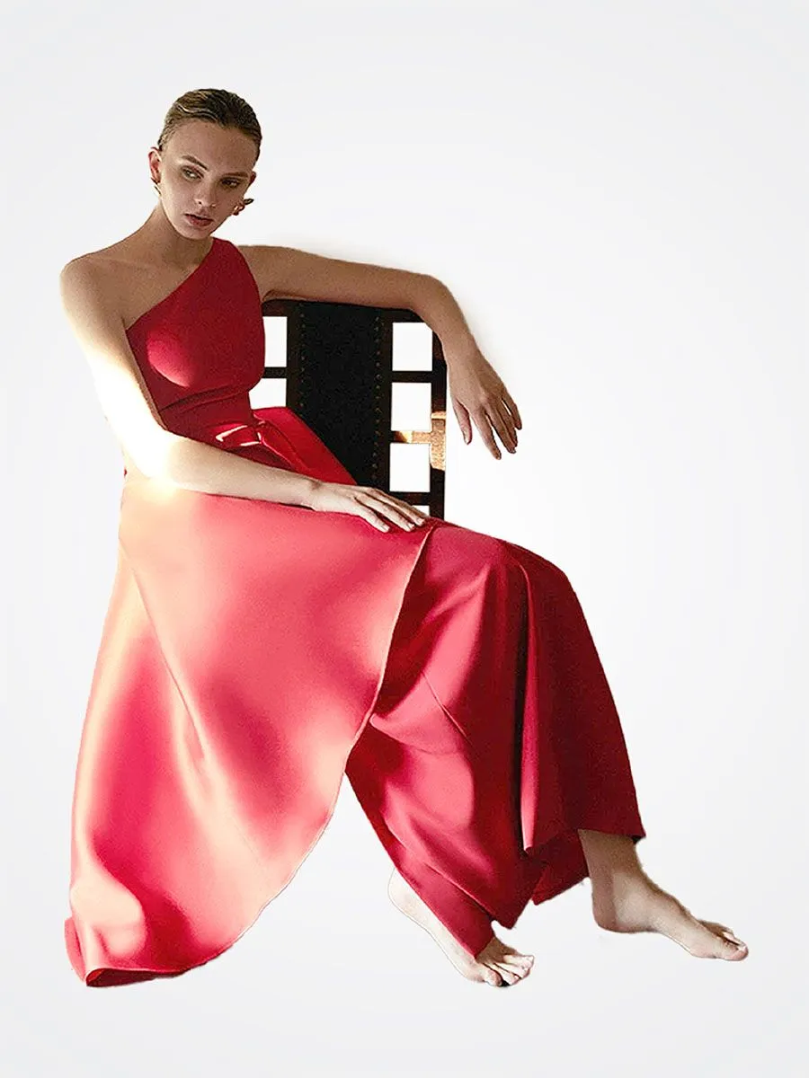 Goudinrqc France “Scarlet Elegance evening dress” "Embrace the allure of twilight as you step into the night, adorned in the sheer elegance that captures the essence of enchantment."