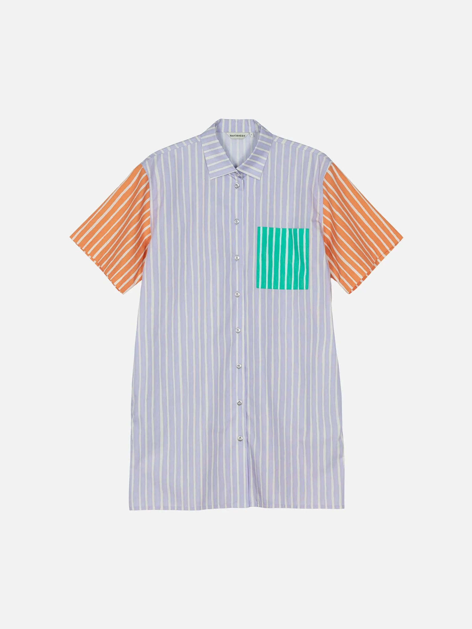 The Jokapoika shirt dress is made of organic cotton, and it has a relaxed, straight fit. The dress features the Piccolo pattern, which is printed in Helsinki. The dress has a pointed collar, a metal button closure, short sleeves, and a chest pocket. The tricolored dress has orange sleeves, a green chest pocket, and a light lilac body.