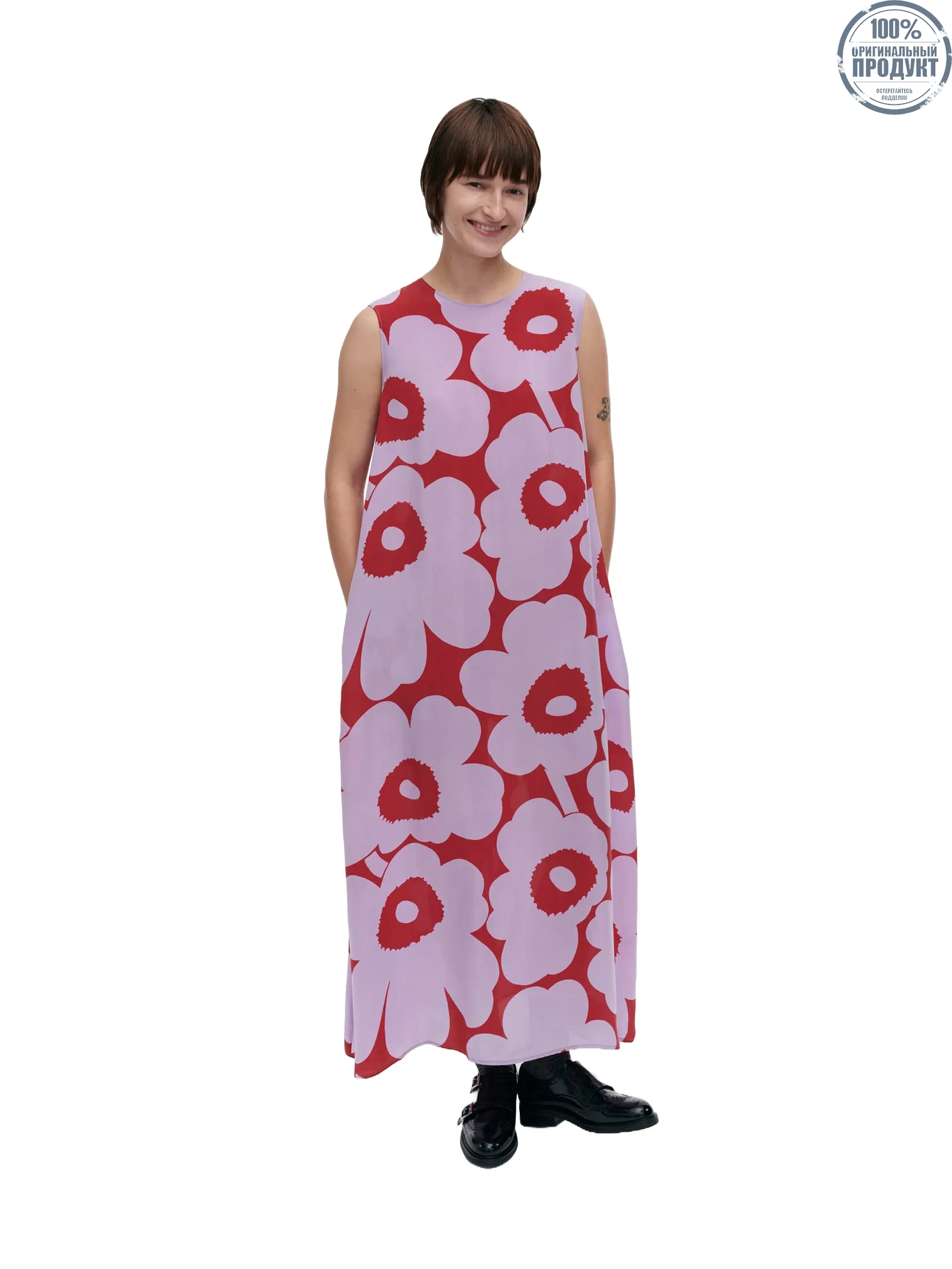 The Migot cupro dress has a slim, A-line fit and it is printed in the Unikko pattern. The sleeveless dress has a concealed zipper with long ribbon pullers at the back neckline and pockets at the side seams.