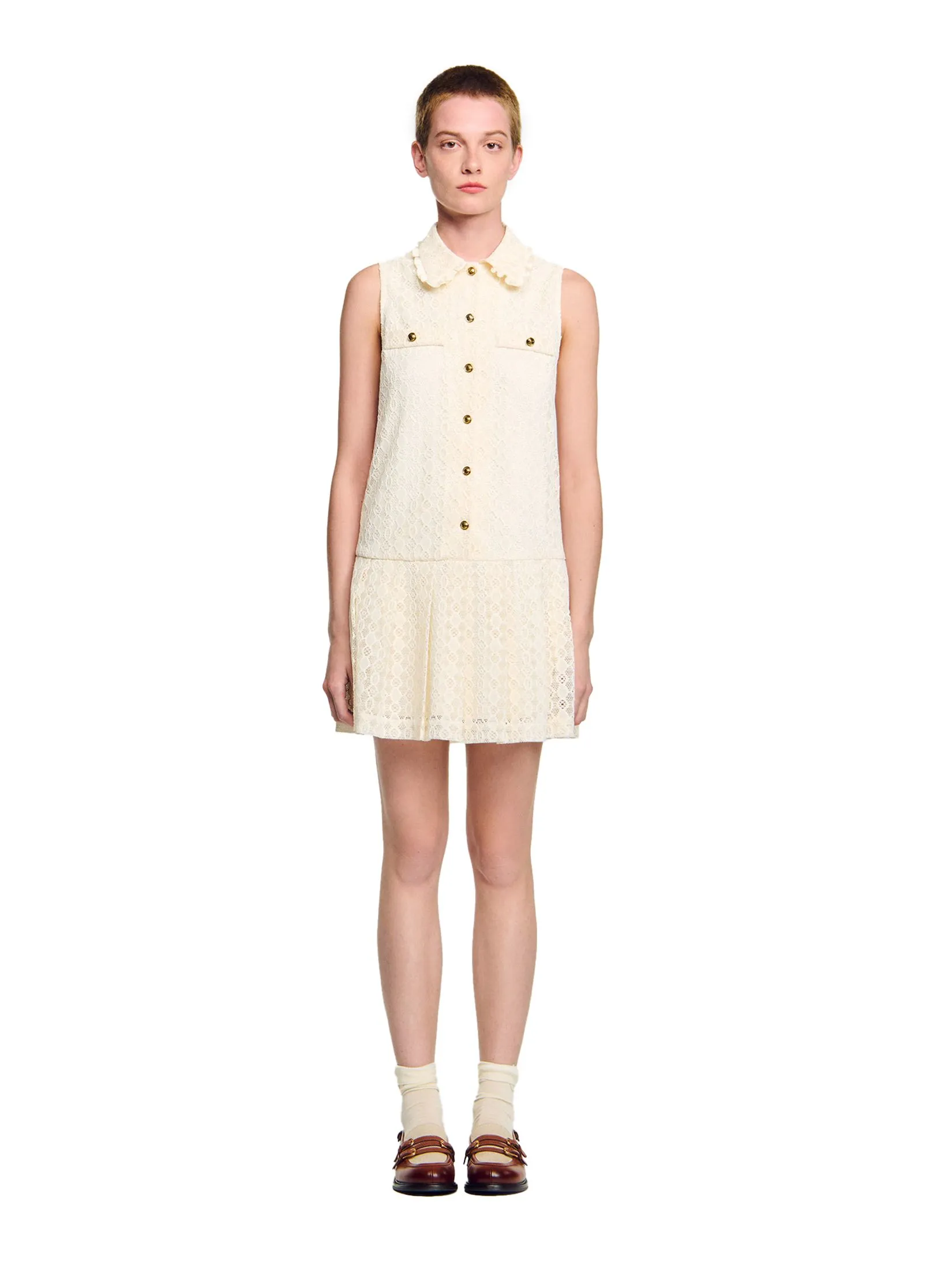 Mini lace dress with a shirt collar, button fastening and short sleeves.\n\nSandro Women's mini dress\nShirt collar\nShort sleeves\nTrim at collar\nMock welt pockets with buttons at chest\nLined\nTrue to size