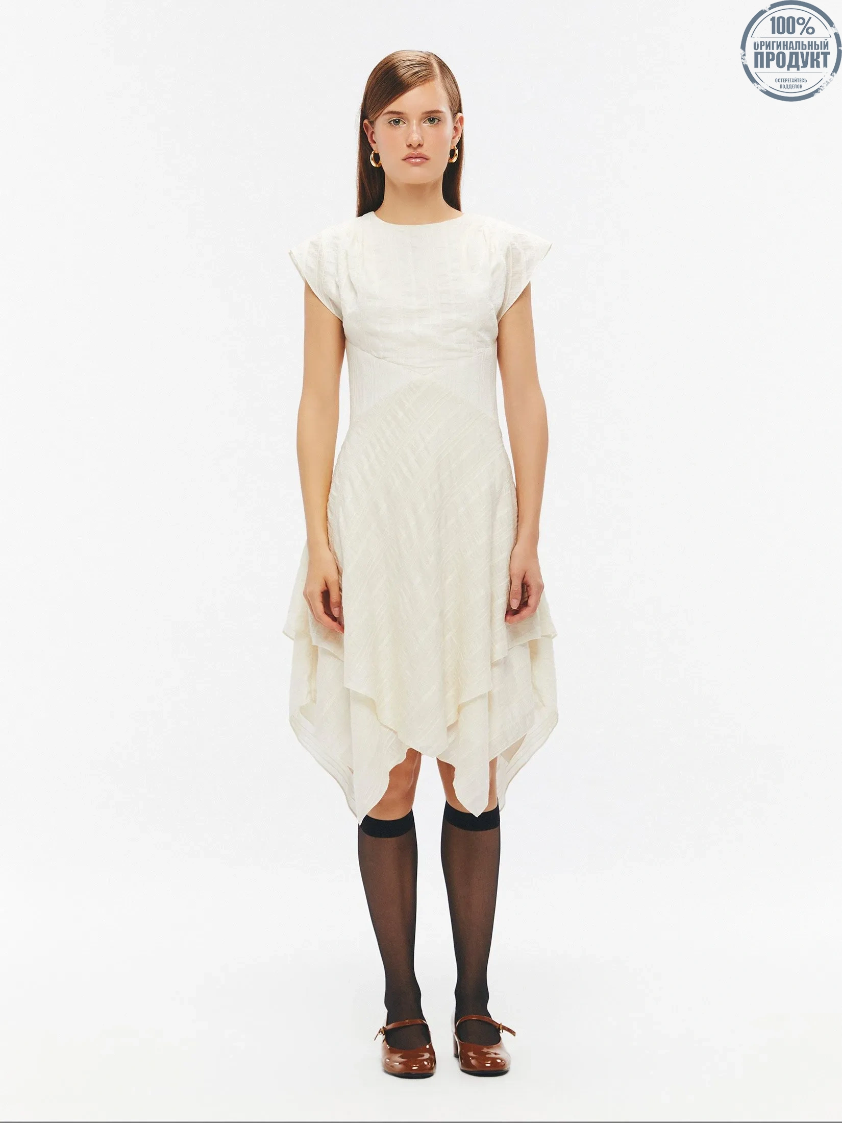 Jacquard dress, woven fabric with alternating stripes, mixed with silk, soft, smooth, light fabric with detailed wrinkles in the fabric, giving it a vintage charm. The dress has layers that overlap, creating soft movement, making the dress look sweet and attractive when worn.