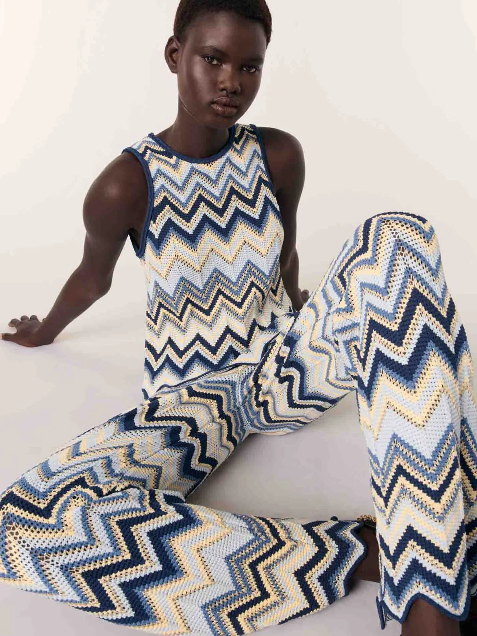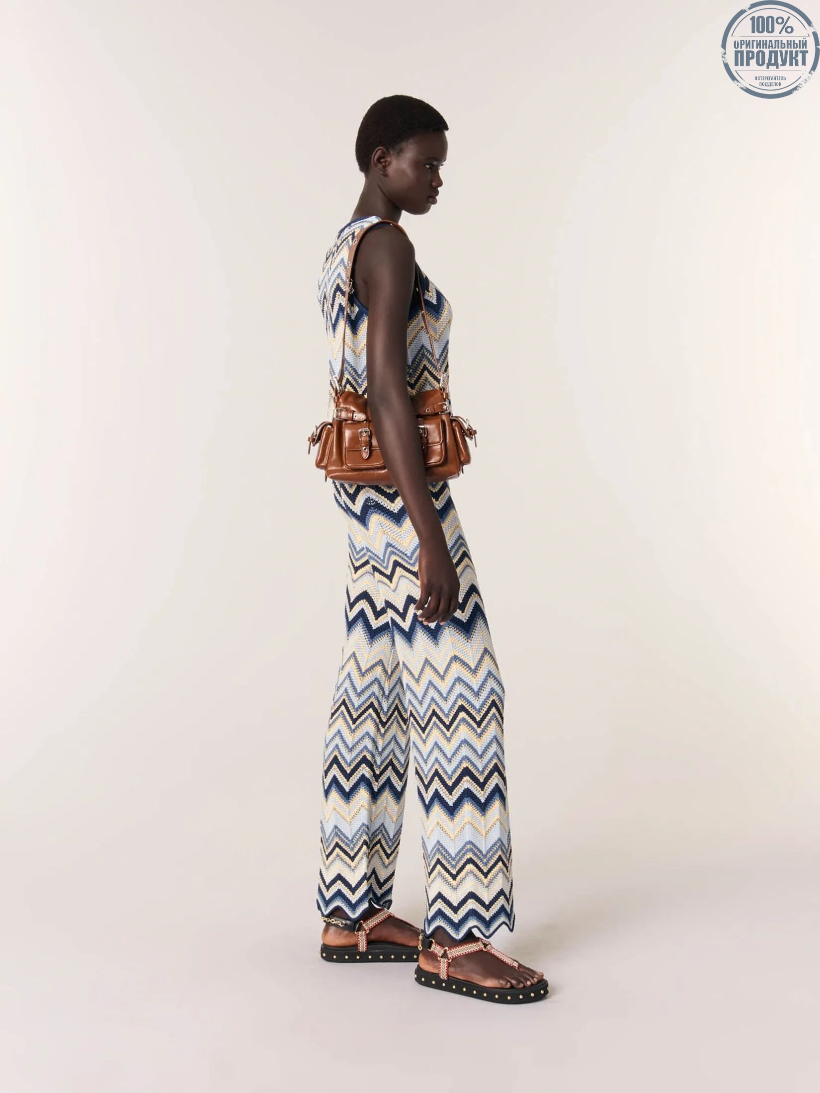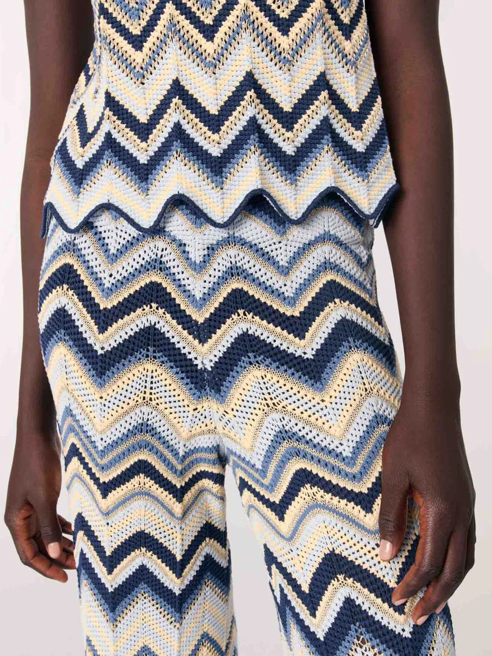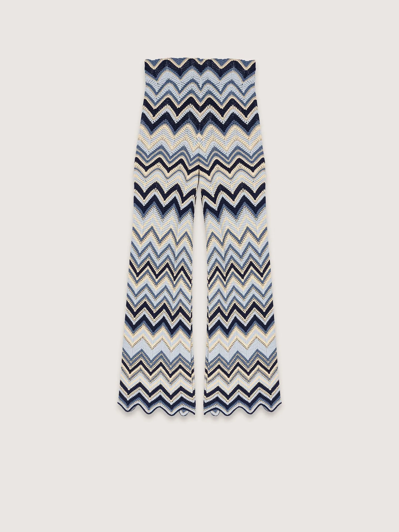 These crochet-knit trousers feature a dainty glittery herringbone pattern. The elasticated waist and flared legs with dainty scalloped edges create a slim silhouette.