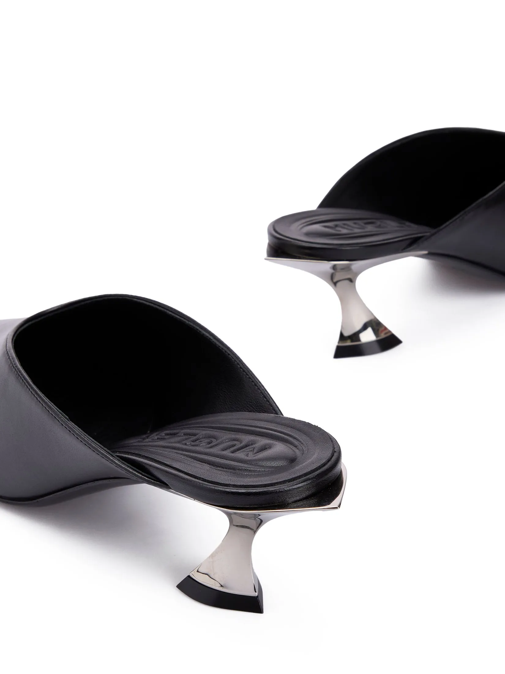 Mugler's experimental style is showcased in these Leather kitten mules. With a sculptural, metallic heel and a leather upper, these slip-on mule sandals are signed off with an elongated toe detail for added edge.