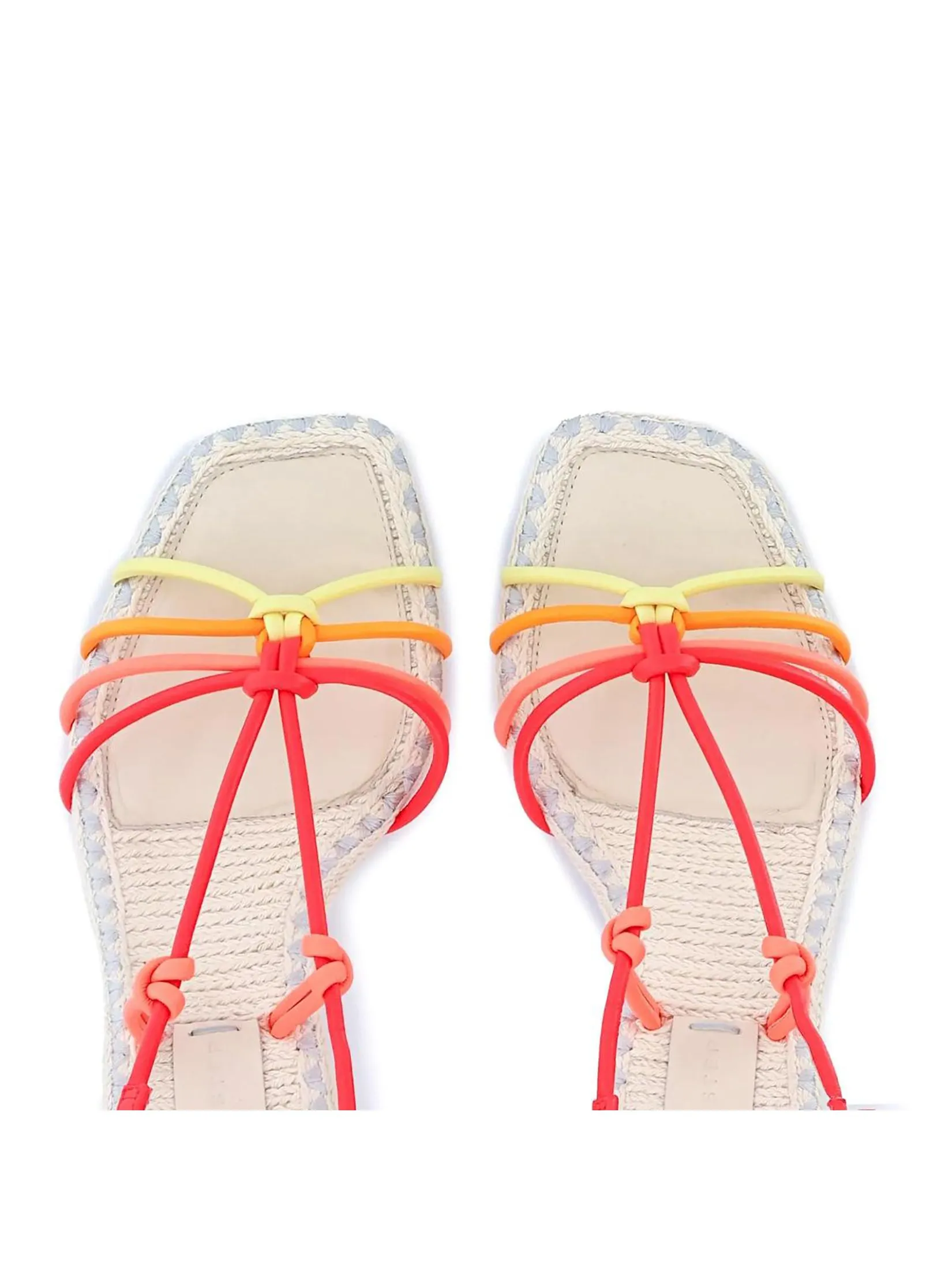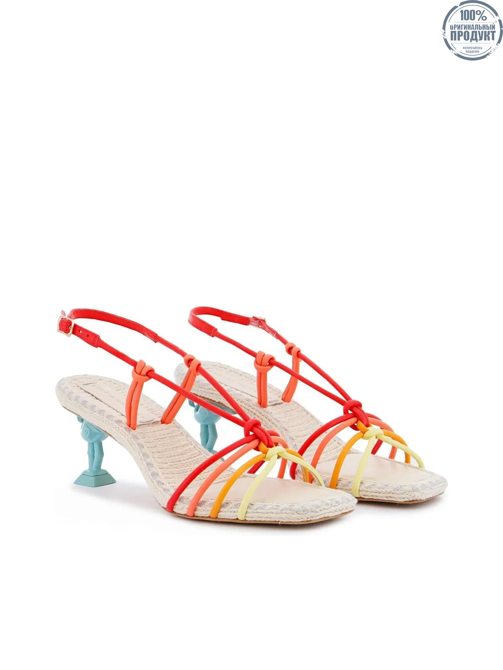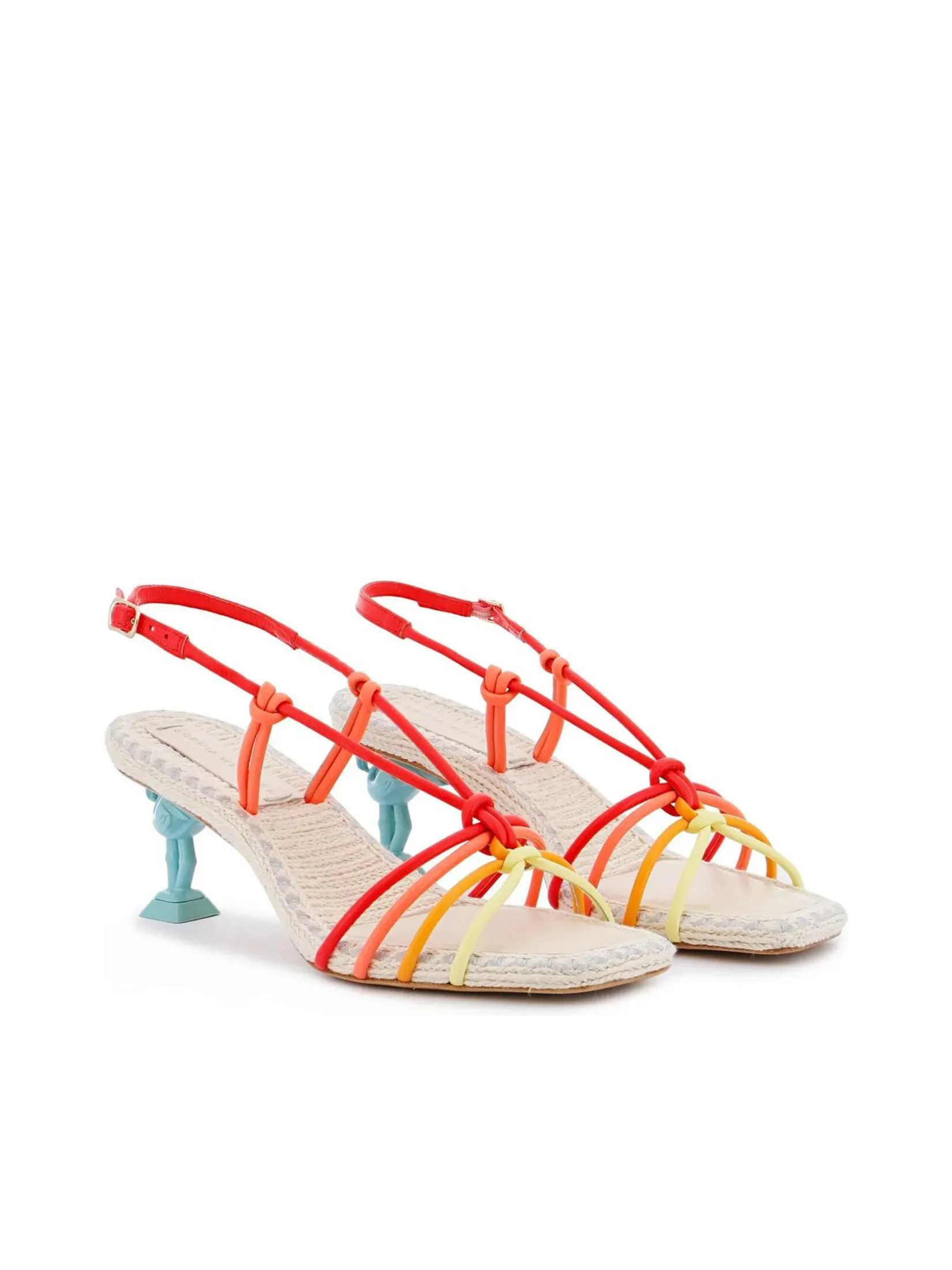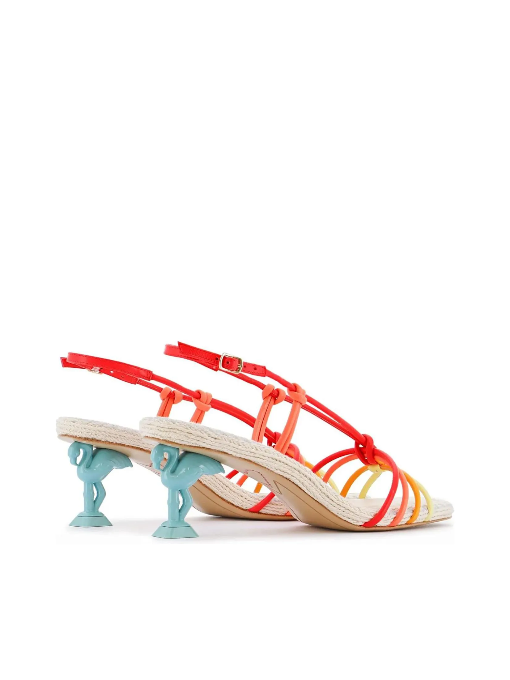 SOPHIA WEBSTER Flo Copacabana' flamingo is now available in a versatile low sandal style and this 'Carnival Sunset' colourway is perfect for dressing up or down! The soft leather straps mimic sunset hues and wrap around the toes whilst also being adjustable at the ankle. The 60mm blue flamingo heel contrasts against the upper and the woven insole comes with a padded leather patch for ultimate comfort. Dress up or dress down, from jeans to summer dresses this sandal has got you covered!