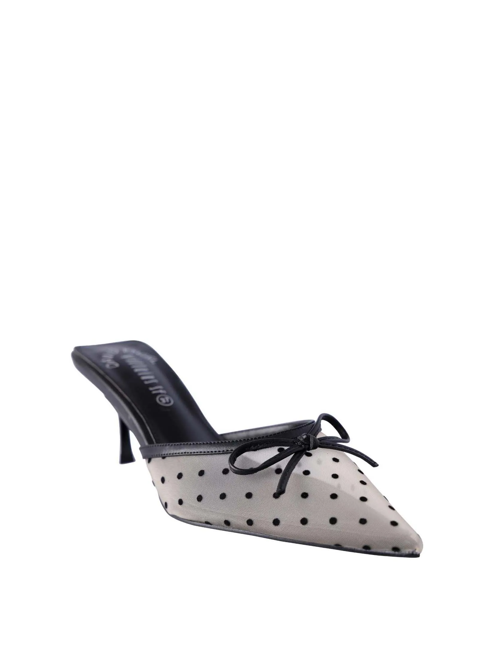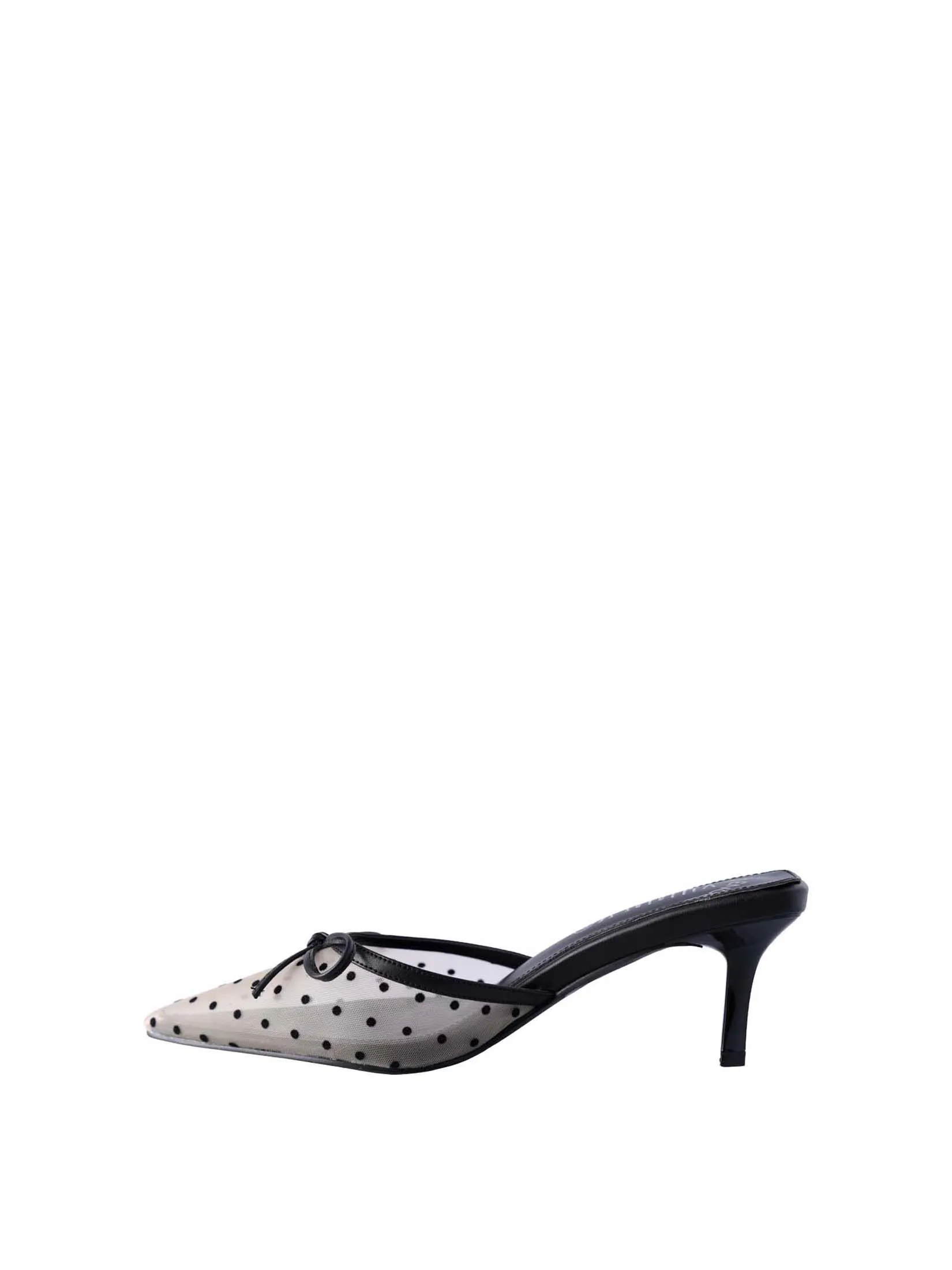 MILLY women's mule heel shoe featuring a modern and elegant design. Pointed toe and is made with a transparent mesh with black polka dots throughout. The upper edge is trimmed with black leather , and there's a small decorative bow detail at the front. The heel is a slim, medium-height stiletto style in black. Slip-on style , making it a convenient and fashionable choice for both casual and semi-formal occasions.