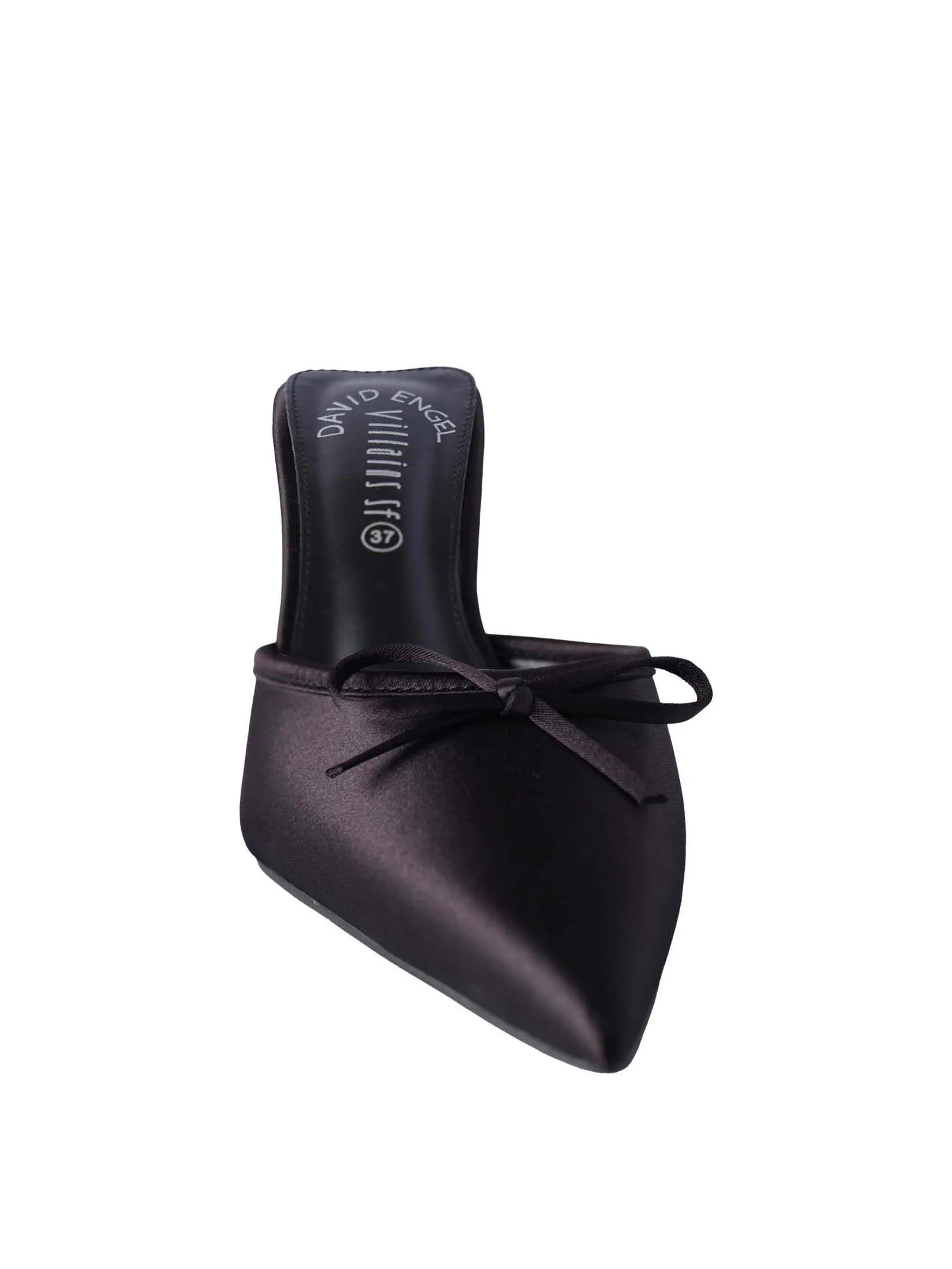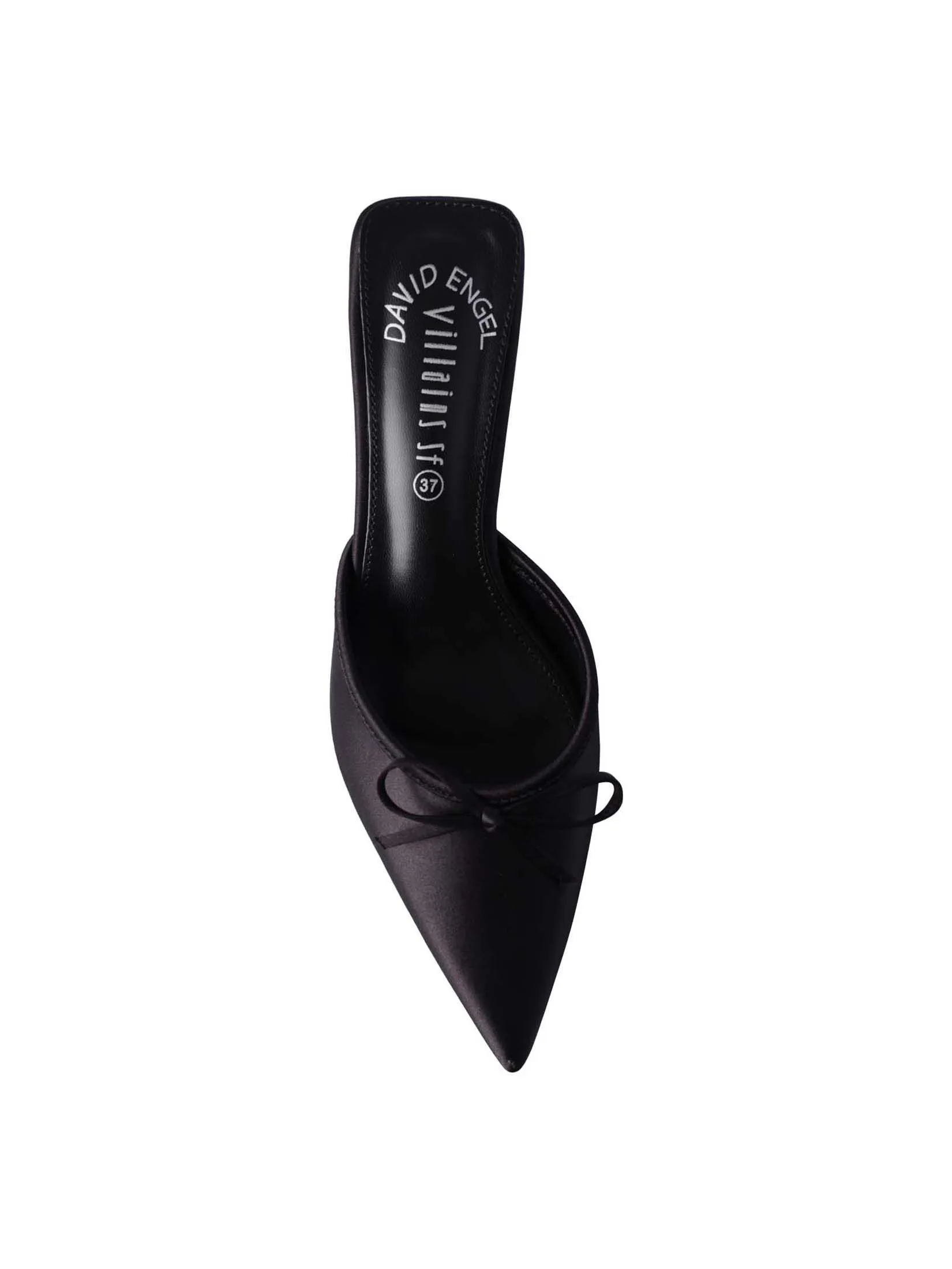RUMI black satin mule heel. Features a pointed toe design with a small decorative bow at the front. The shoe is backless (slip-on style) with a sleek, medium-height stiletto heel. Material appears to be smooth and has a subtle sheen characteristic of satin fabric. This style of shoe is often considered elegant and versatile, suitable for both formal occasions and business attire. The minimalist design is enhanced by the shoe's monochromatic black color scheme. Mules like this are popular for their easy slip-on nature while maintaining a sophisticated appearance.