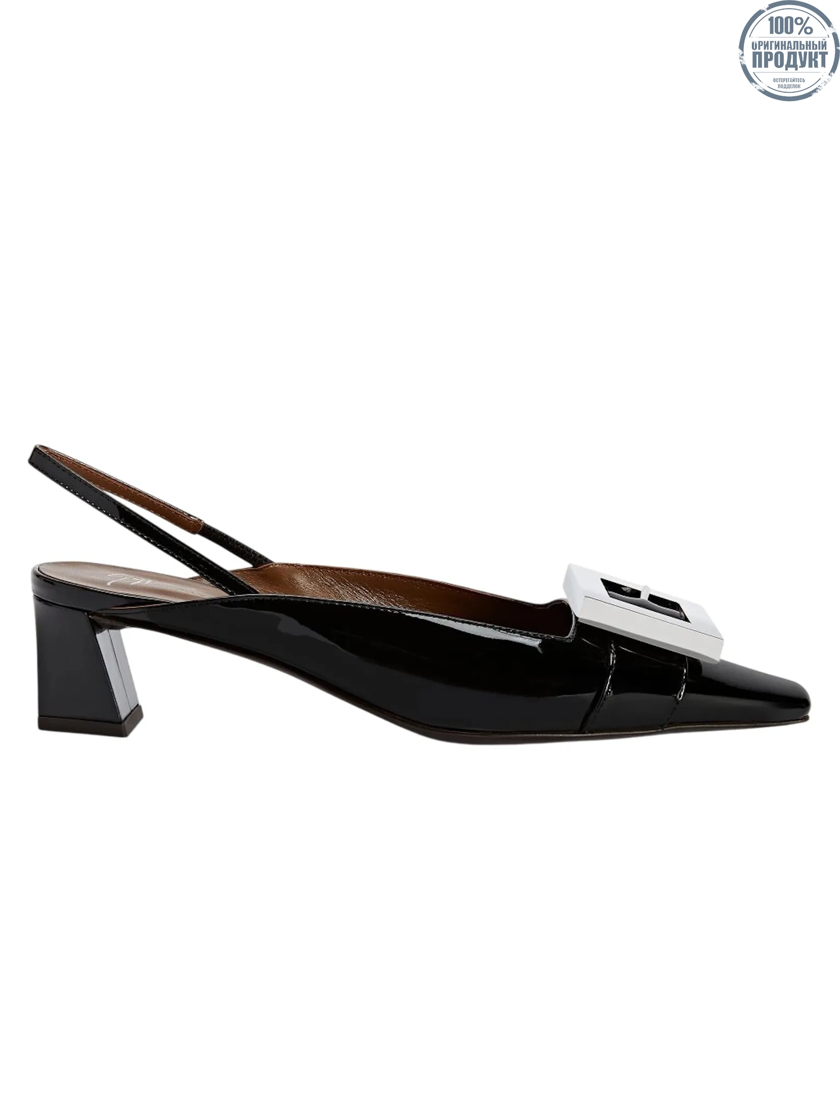 Patent leather slingback pumps with square topline and toe, metal maxi buckle, rear strap with elastic insert and block heel.